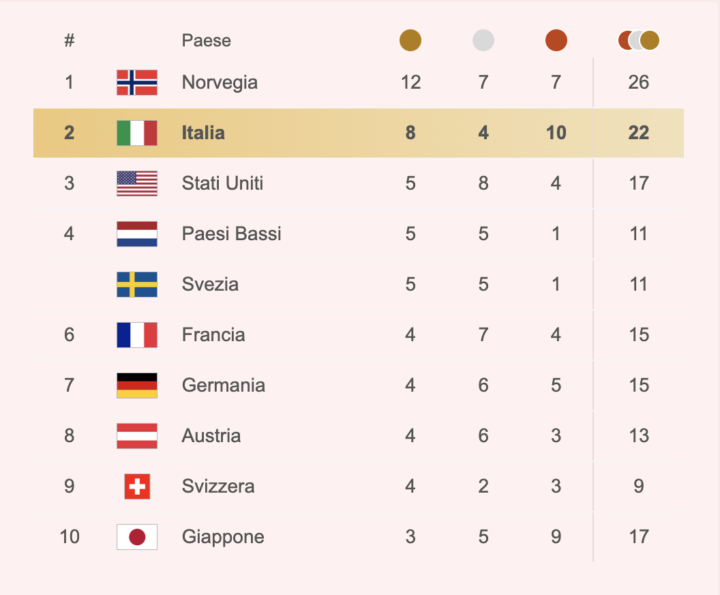 Il solito incompetente ed ignorante che scrive a gettone sul proprio sito locale letto da quattro gatti, parla di un medagliere vuoto restituito come pieno” non sapendo (brutto male l’ignoranza per un giornalista…) che l’ Italia nella decima giornata dei Giochi olimpici di Milano Cortina è al secondo in posto nella classifica delle medaglie conquistate !
