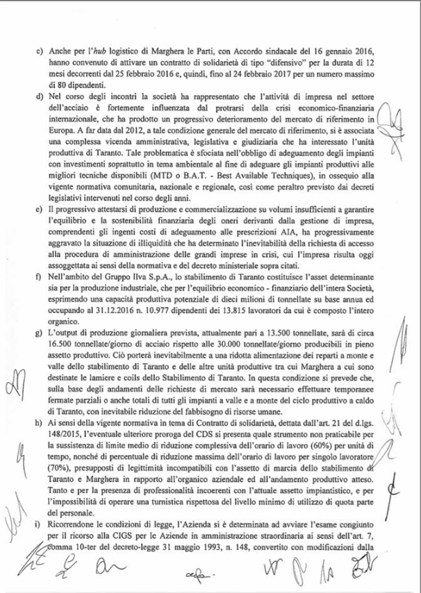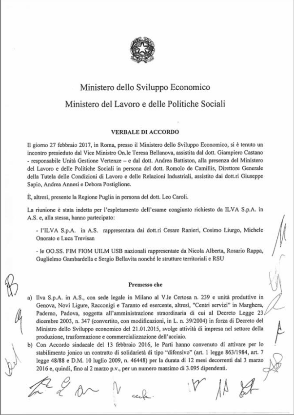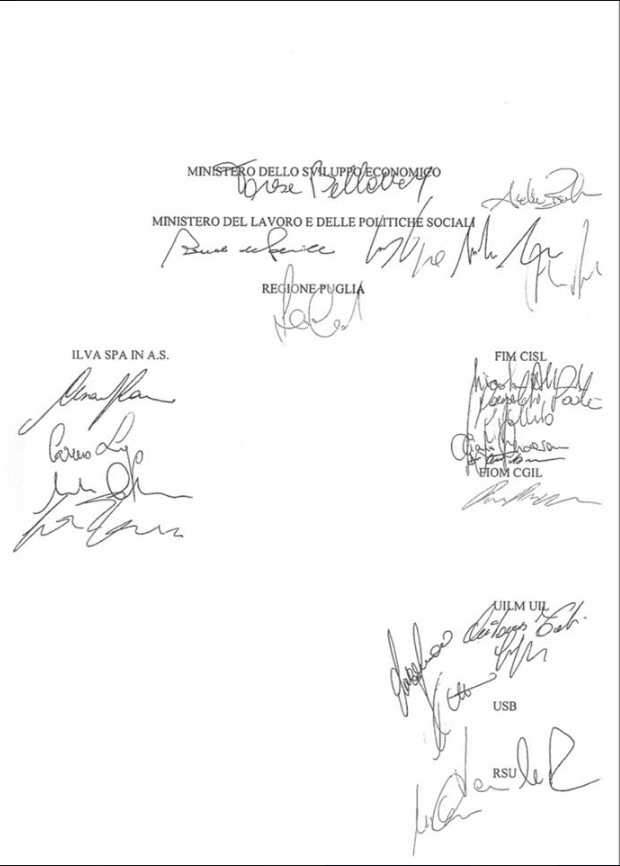 I sindacati FIM-CISL e UILM hanno sottoscritto l’intesa in quanto coerente con le richieste avanzate nel corso del negoziato, mentre la Fiom–CGIL ha firmato con riserva prendendosi 24 ore di tempo per rientrare a Taranto discuterne con tutti i delegati di ILVA. Con un comunicato stampa Rosario Rappa, segretario nazionale della Fiom-CGIL “giudica positivo l’accordo sottoscritto e domani riunirà tutti i delegati dello stabilimento di Taranto per illustrare i contenuti dell’accordo, acquisirne la validazione e sciogliere la riserva.” Solo che nell’accordo sottoscritto che il CORRIERE DEL GIORNO pubblica di seguito, INTEGRALMENTE in esclusiva, di questa “riserva” non vi è alcuna traccia !