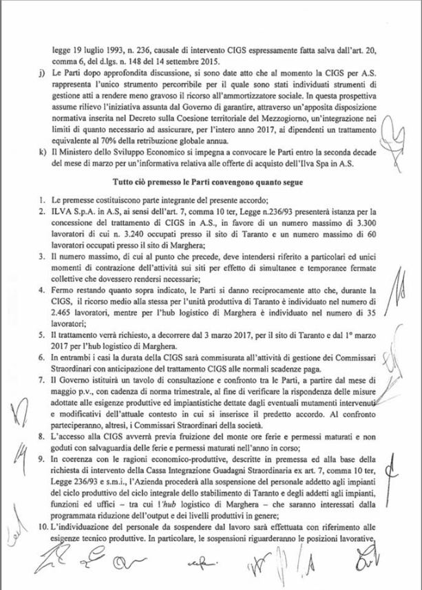 La cassa integrazione riguarderà mediamente 2.500 persone dei quali 2.465 a Taranto e 35 a Marghera. L’accordo avrà valore sino al termine dell’amministrazione straordinaria, in attesa che si concludano le procedure di cessione del più grande stabilimento siderurgico d’ Europa .