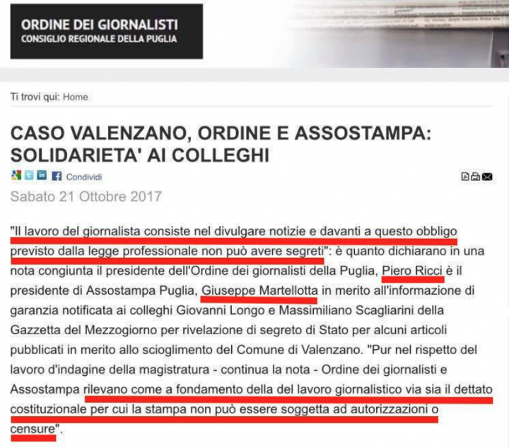 In difesa dei due giornalisti baresi sono intervenuti come sempre in “accoppiata” l’ Ordine dei giornalisti di Puglia e l’ associazione sindacale pugliese Assostampa con un comunicato in cui contestando la decisione della D.D.A. di Bari, sostengono che “pur nel rispetto del lavoro d’indagine della magistratura , rilevano come a fondamento del lavoro giornalistico vi sia il dettato costituzionale per cui la stampa non può essere soggetta ad autorizzazioni o censure“.