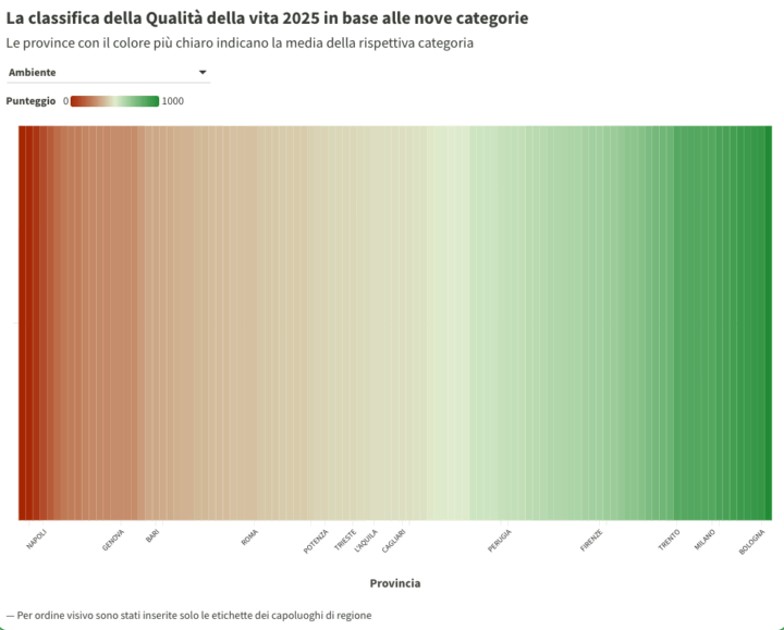 La dimensione dell’ambiente è articolata in due sottodimensioni: quella negativamente associata alla qualità della vita comprende indicatori di impatto ambientale, mentre nella sottodimensione positiva figurano anche variabili il cui andamento può essere messo in relazione con le azioni degli amministratori locali. È ancora Bolzano in vetta: apre la classifica della qualità ambientale, seguita da Bologna, Bergamo e Reggio Emilia. Nelle 19 posizioni di testa figurano 6 province del Nord-Ovest; 12 province del Nord-Est e Macerata in rappresentanza dell’Italia centrale. In coda si confermano anche per il 2025 Palermo e Catania.