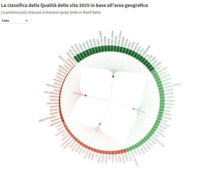 Per Alessandro Polli, docente di Statistica economica e Analisi delle serie storiche all’Università La Sapienza di Roma: “L’indagine sulla qualità della vita – giunta alla 27ª edizione – è uno degli studi più completi disponibili in Italia. Si articola in nove dimensioni e 97 indicatori che permettono un’analisi approfondita del contesto locale. L’edizione di quest’anno conferma tre tendenze: la crescente frattura tra il centro-nord, più resiliente, e il Mezzogiorno, sempre più vulnerabile; la presenza di ampie aree di disagio sociale nel sud, difficili da affrontare nell’attuale quadro di finanza pubblica; e il consolidamento del primato delle province e città metropolitane del centro-nord, che anche nella fase economica e geopolitica attuale mostrano la maggiore capacità di resistenza”.
