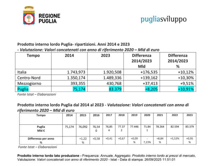 Dal 2014 al 2023 il Pil della Puglia è aumentato di 8,2 miliardi: è cresciuto cioè del 10,91%. L’incremento pugliese supera il dato medio dell’Italia (+10,12%), del Centro-Nord (+10,30%) e del Mezzogiorno (+9,51%) ed ha una particolarità: coincide quasi totalmente con il valore degli investimenti realizzati dalle imprese pugliesi con gli strumenti di agevolazione della Regione Puglia (Sviluppo economico) gestiti da Puglia Sviluppo in quegli stessi anni, investimenti pari a 8,4 miliardi di euro.