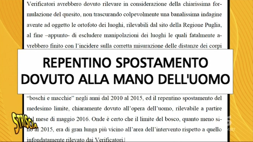 Dalla precedente decisione del Consiglio di Stato (fine 2015) all’arrivo dei verificatori del Consiglio di Stato (maggio 2016) scompaiono come se niente fosse, e senza che nessuno degli enti pubblici territoriali se ne accorgesse…la bellezza di 5000 ettari di bosco. A portare alla luce l’accaduto è l’avvocato Semeraro della Provincia di Taranto, il quale dopo la visita dei verificatori sottolinea la presenza di una mano umana dietro la scomparsa del bosco. I verificatori, infatti proprio in virtù di questa scomparsa riuscirono a verificare una distanza di 100,99 metri dall’impianto. E proprio grazie ai quei 99 centimetri l’opera poteva essere realizzata e quindi il Consiglio di Stato confermò la precedente decisione del Tar e quindi ad Appia Energy.