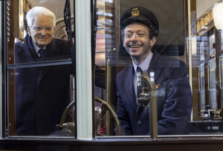 Dopodichè è andato in onda un video narrativo che ha accompagnato l’arrivo delle autorità. Un tram storico ha attraversato Milano, trasportando un passeggero misterioso, osservato inizialmente solo di spalle. Famiglie, bambini, giovani e adulti salgono alle fermate. Durante il tragitto, un gesto semplice e umano – il recupero di un peluche caduto – svela l’identità del passeggero: è Sergio Mattarella il Presidente della Repubblica Italiana . Al capolinea, davanti allo Stadio di San Siro, il conducente del tram lo saluta: è Valentino Rossi, in un cameo che unisce sport e immaginario collettivo.