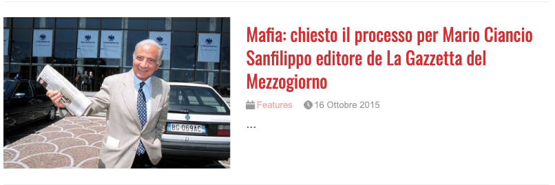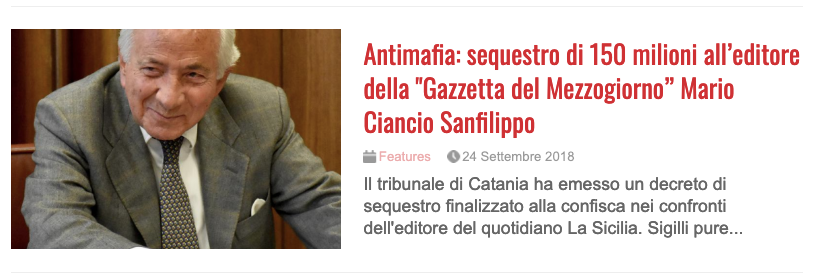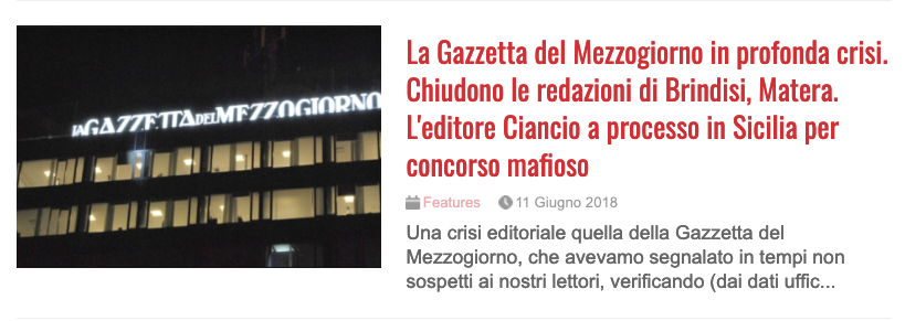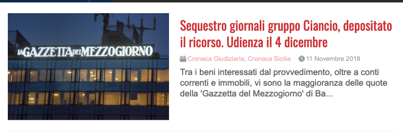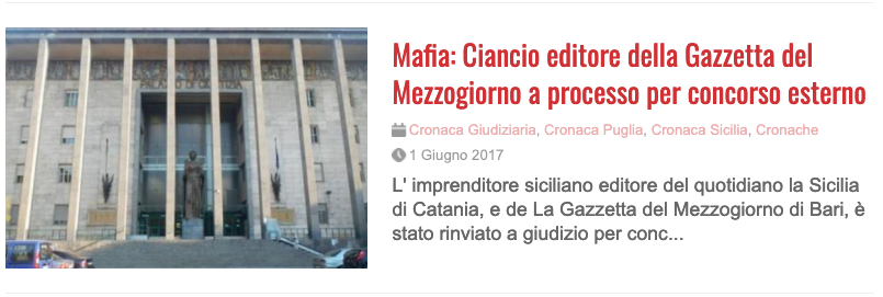 Il CORRIERE DEL GIORNO seppure sia stato ricoperto da offese, diffamazioni e calunnie da parte di una irrisoria “cricca” di giornalisti della Gazzetta del Mezzogiorno (guarda caso tutti impegnati sindacalmente) ha sempre correttamente seguito e scritto sin dall’ ottobre 2015 sulle vicende giudiziarie degli ultimi anni di Mario Ciancio di Sanfilippo, che invece venivano incredibilmente taciute ed occultate dalla direzione del quotidiano barese. Ed in un nostro articolo abbiamo spiegato tutto quello che sinora la Gazzetta non ha rivelato ai propri lettori. Leggere per credere. (vedi QUI)
