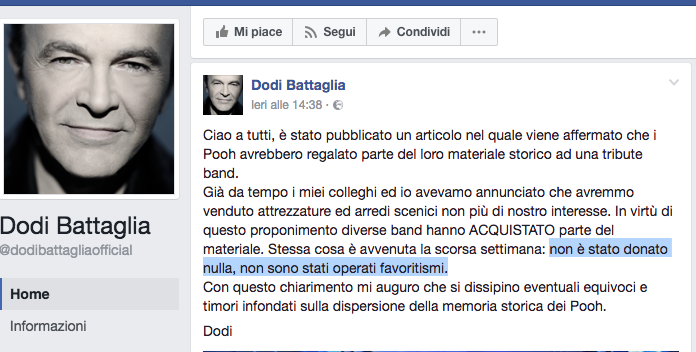 Ma all’improvviso ieri si è rivelata una “pasquetta” amara per il giornalista tarantino, che è stato smentito ufficialmente e pubblicamente proprio da Dodi Battaglia dei Pooh il quale ha scritto sulla sua pagina Facebook : “Ciao a tutti” inizia così il post “è stato pubblicato un articolo nel quale viene affermato che i Pooh avrebbero regalato parte del loro materiale storico ad una tribute band. Già da tempo i miei colleghi ed io avevamo annunciato che avremmo venduto attrezzature ed arredi scenici non più di nostro interesse. In virtù di questo proponimento diverse band hanno ACQUISTATO parte del materiale. Stessa cosa è avvenuta la scorsa settimana: non è stato donato nulla, non sono stati operati favoritismi“. Con questo chiarimento mi auguro che si dissipino eventuali equivoci e timori infondati sulla dispersione della memoria storica dei Pooh. Dodi“