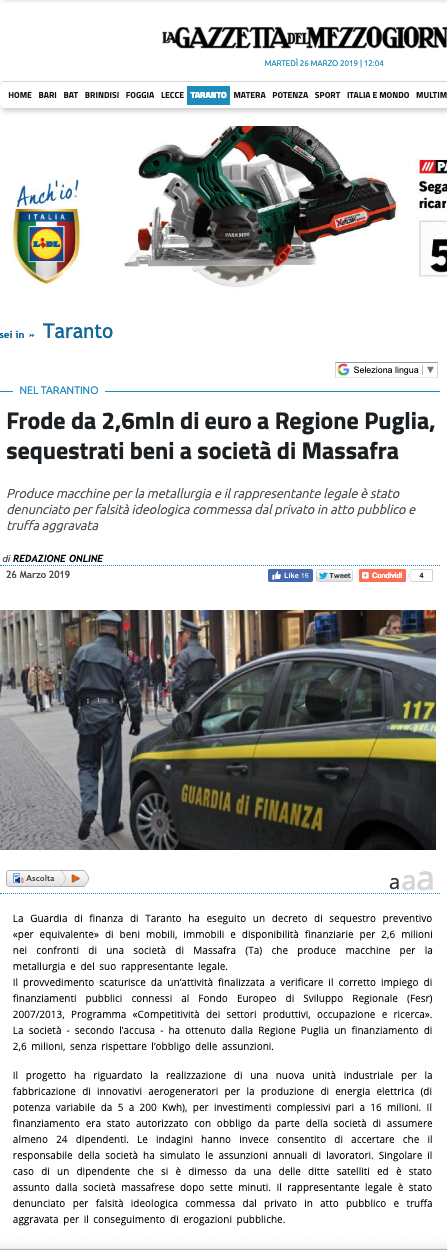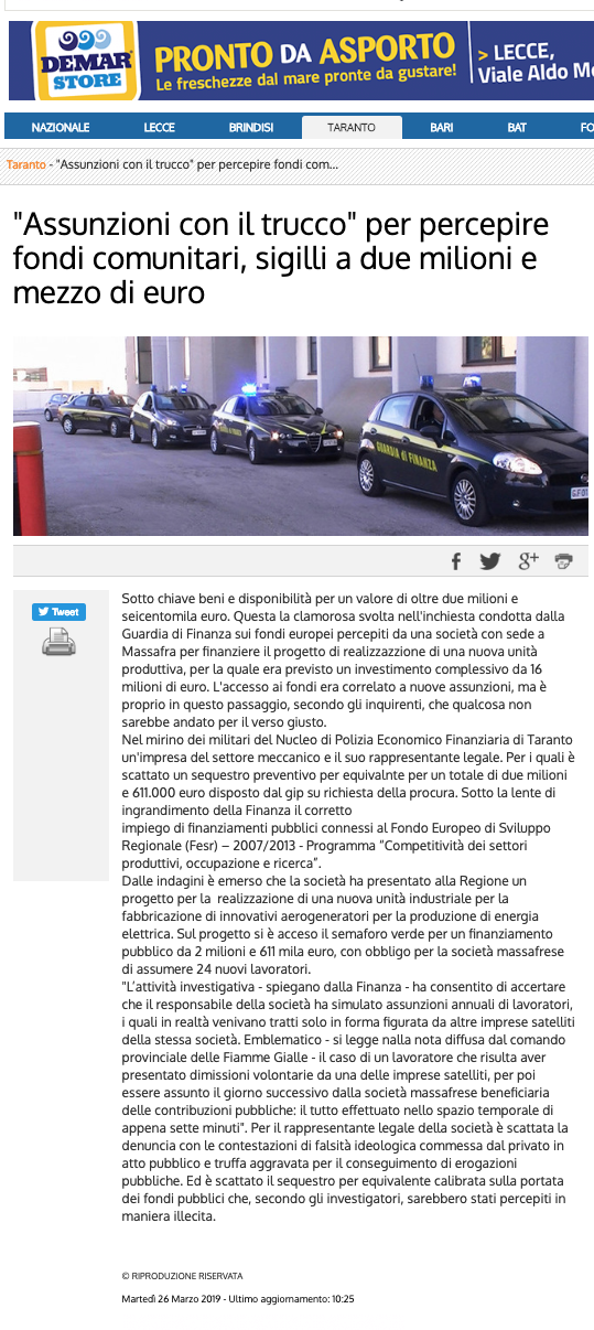 Il provvedimento, emesso dal G.I.P. dr. Giuseppe Tommasino del Tribunale di Taranto su proposta della locale Procura della Repubblica, consegue ad un’attività condotta dal Reparto di Polizia Economico Finanziaria della Guardia di Finanza guidato dal Ten. Col Antonucci , finalizzata a verificare il corretto impiego di finanziamenti pubblici connessi al Fondo Europeo di Sviluppo Regionale (FESR) – 2007/2013 – Programma “Competitività dei settori produttivi, occupazione e ricerca”.