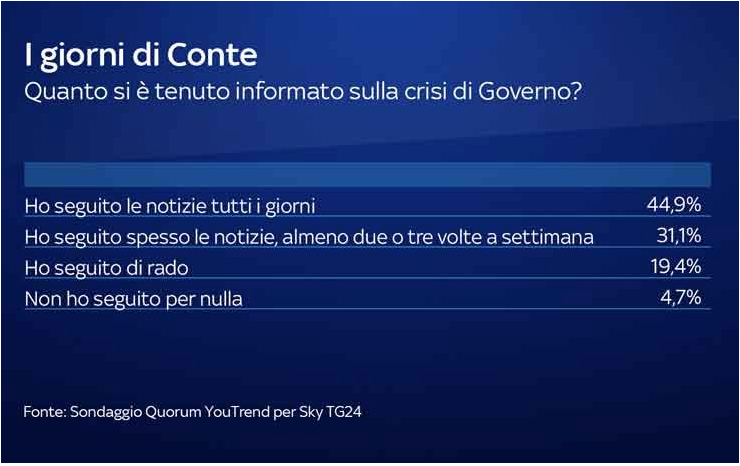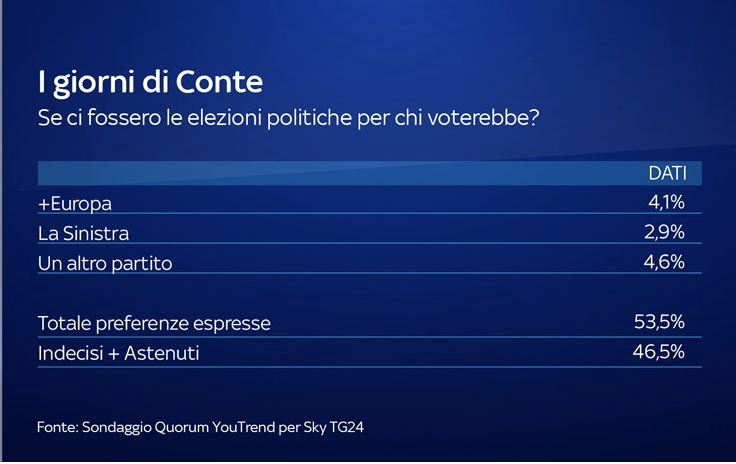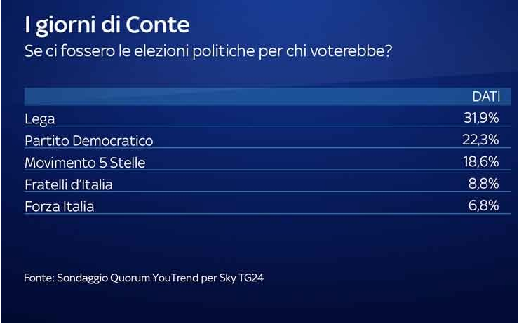 Nel sondaggio di Quorum-Youtrend emerge inoltre che migliora la percezione del campione nei confronti di Giuseppe Conte, unico politico insieme al presidente della Repubblica Sergio Mattarella a conquistare più del cinquanta per cento di fiducia. Il 42,8% degli italiani pensa inoltre che sarebbe stato meglio andare subito al voto piuttosto che affidarsi a un governo a maggioranza Pd-M5s.