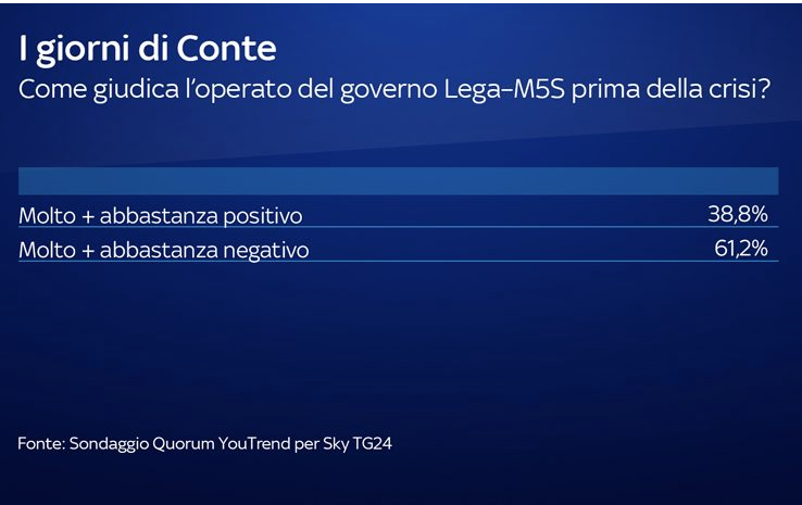 Nota metodologica: sondaggio SKY Agosto Sondaggio svolto tra il 29 e il 30 agosto 2019 con metodologia mista CATI/CAMI/CAWI su un campione di 1000 intervistati rappresentativi della popolazione maggiorenne residente in Italia, indagata per quote di genere ed età, stratificate per area macroregionale di residenza e titolo di studio. L’errore campionario è pari a +/- 3,1%, con un intervallo di confidenza del 95%