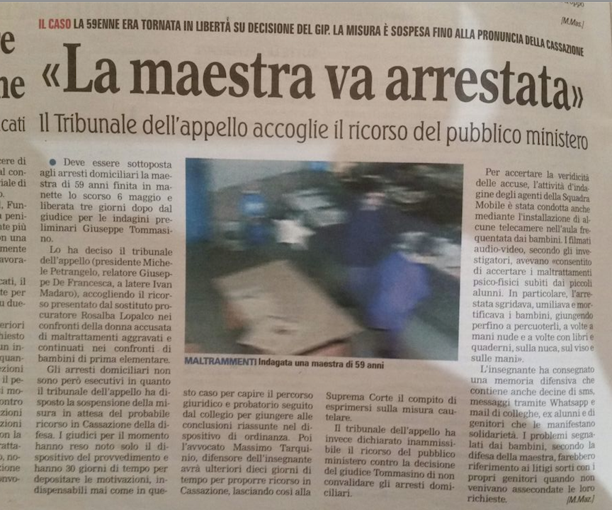 Il cronista così scriveva e titolava : “La maestra va arrestata – Il Tribunale dell’ appello accoglie il ricorso del pubblico ministero” . Basta leggere quanto scritto dal giornale barese, per rendersi conto di come alcuni giornali e giornalisti cerchino il titolo ad effetto, sbattendo il cosiddetto mostro in prima pagina , dimenticando e calpestando persine le norme previste dalla deontologia giornalistica, figuriamoci il doveroso rispetto per la presunzione d’innocenza.