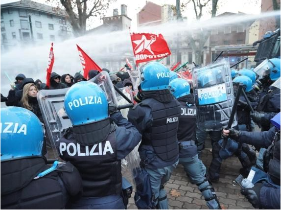 Durante il corteo dopo lo sgombero di Askatasuna. Un gruppo di persone incappucciate in testa alla manifestazione ha cercato di sfondare il cordone della Polizia lanciando bottiglie e oggetti. Le forze dell’ordine hanno risposto con idranti e lacrimogeni. Ci sono state cariche con manganellate da un lato e bastonate da parte dei manifestanti. La guerriglia urbana in corso Regina Margherita a Torino è cominciata all’angolo con via Vanchiglia, quando i manifestanti hanno visto in lontananza la sagoma di Askatasuna.