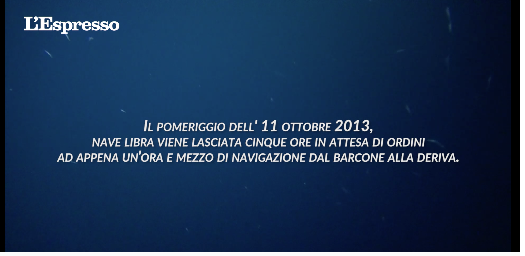 Nave Libra, il pattugliatore della Marina italiana, è ad appena un’ora e mezzo di navigazione da un barcone carico di famiglie siriane che sta affondando. Ma per cinque ore viene lasciata in attesa senza ordini. Il pomeriggio dell’11 ottobre 2013 i comandi militari italiani sono preoccupati di dover poi trasferire i profughi sulla costa più vicina. Così non mettono a disposizione la loro unità, nonostante le numerose telefonate di soccorso e la formale e ripetuta richiesta delle Forze armate maltesi di poter dare istruzioni alla nave italiana perché intervenga. Il peschereccio, partito dalla Libia con almeno 480 persone, sta imbarcando acqua: era stato colpito dalle raffiche di mitra di miliziani che su una motovedetta volevano rapinare o sequestrare i passeggeri, quasi tutti medici siriani. Quel pomeriggio la Libra è tra le 19 e le 10 miglia dal barcone. Lampedusa è a 61 miglia.