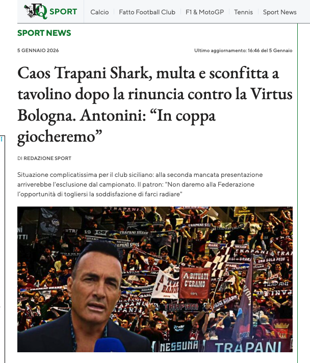 Scriveva lo scorso 5 gennaio il Fatto Quotidiano: “Perdita della gara e omologazione della stessa con il risultato di 20-0 con obbligo del Trapani Shark S.S.D. A R.L. di pagamento dell’ammenda di euro 50mila prevista per la prima rinuncia alle gare”. Così in una nota il giudice sportivo ha decretato la scontata sconfitta a tavolino al club di basket trapanese dopo la mancata presentazione per il match contro la Virtus Bologna previsto per domenica 4 gennaio. Il club siciliano aveva comunicato via mail “l’impossibilità di partecipare alla gara” “per asseriti motivi di forza maggiore ritenuti dalla LBA non idonei a giustificare il rinvio di gare già calendarizzate”, si legge ancora nella nota del giudice sportivo.