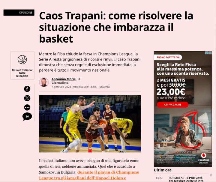 Scrive la Gazzetta dello Sport: “La Fiba ha immediatamente decretato la conclusione della serie: la gara di ritorno di domani non si giocherà, Trapani è fuori dall’Europa. Ed è un bene, considerato il rischio di una nuova figuraccia, stavolta in Sicilia. In Italia invece, dove evidentemente non si riesce a creare un meccanismo di salvaguardia, il braccio di ferro e la battaglia legale proseguono. L’attesa, al netto dei prossimi, eventuali, pronunciamenti del Tribunale federale sui fascicoli aperti, è concentrata sulla giornata di sabato, come se non bastasse una rinuncia (quella di domenica scorsa a Bologna) per considerare sufficientemente falsata l’equità competitiva di un torneo così importante come la Serie A. La partita contro Trento dirà se Trapani verrà esclusa dal campionato oppure se proseguirà e con quali intenti. Perché della squadra che ha iniziato la stagione è rimasto quasi nulla e i punti di penalizzazione sono già 8. In ogni caso, il limite è stato decisamente superato e i danni sono ingenti per il basket italiano e per i tifosi di Trapani, vittime incolpevoli di questo caos“