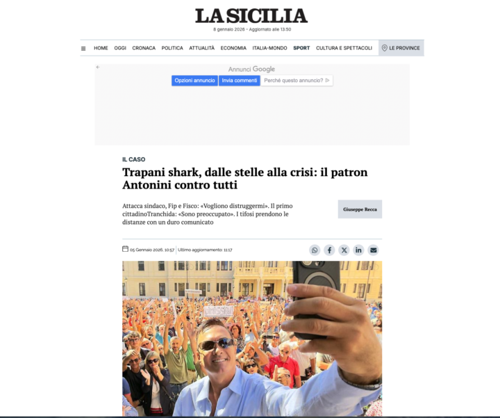 “Valerio Antonini sta portando l’intero panorama sportivo nazionale” scrive il quotidiano LA SICILIA “e con esso la reputazione della città di Trapani, in una situazione di serio imbarazzo. La comunità aveva riposto fiducia in questo imprenditore romano che aveva deciso di investire nel territorio d’origine della moglie e che era stato addirittura premiato con la cittadinanza onoraria. Ma da mesi, da quando è scoppiata la polemica del palazzetto dello sport, Antonini attacca chiunque: prima il sindaco, poi la stampa e i tifosi, poi la Federazione Italiana Pallacanestro, che nei giorni scorsi ha inflitto alla Trapani Shark altri tre punti di penalizzazione da scontare nel campionato in corso, oltre a due anni di inibizione personale come presidente della società.