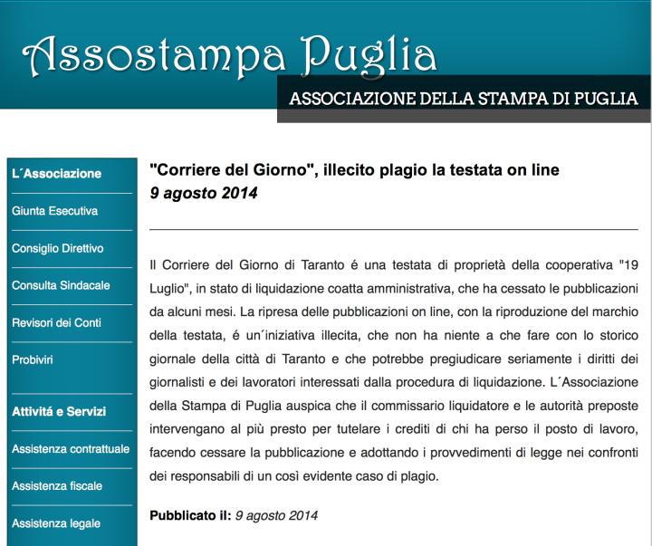 La realtà è ben differente. Se vi sia stato un giornale a commettere un plagio, quello è stato proprio il Corriere del Giorno di Puglia e Lucania , tanto a “caro” ai sindacalisti pugliesi, che è stato fondato e registrato nel Tribunale della Stampa del Tribunale di Taranto nel 1984 insieme alla fallita Cooperativa 19 luglio che lo editava (a spese del contribuente ! ) , millantando di essere stato fondato nel 1947, data in cui venne fondato da mio padre e dai suoi soci e colleghi Acquaviva, Ferraiolo e Stagno, lo storico quotidiano che non alcun riferimento o collegamento legale e/o societario con quello fallito, e di cui è stata disposta (leggi QUI) la liquidazione coatta amministrativa dal Ministero dello Sviluppo Economico nell’ ottobre 2013 e che ha cessato le pubblicazioni nel marzo 2014 su decisione del commissario liquidatore Mauro Damiani.