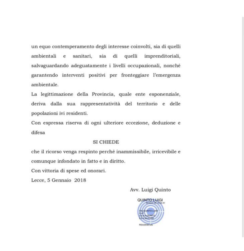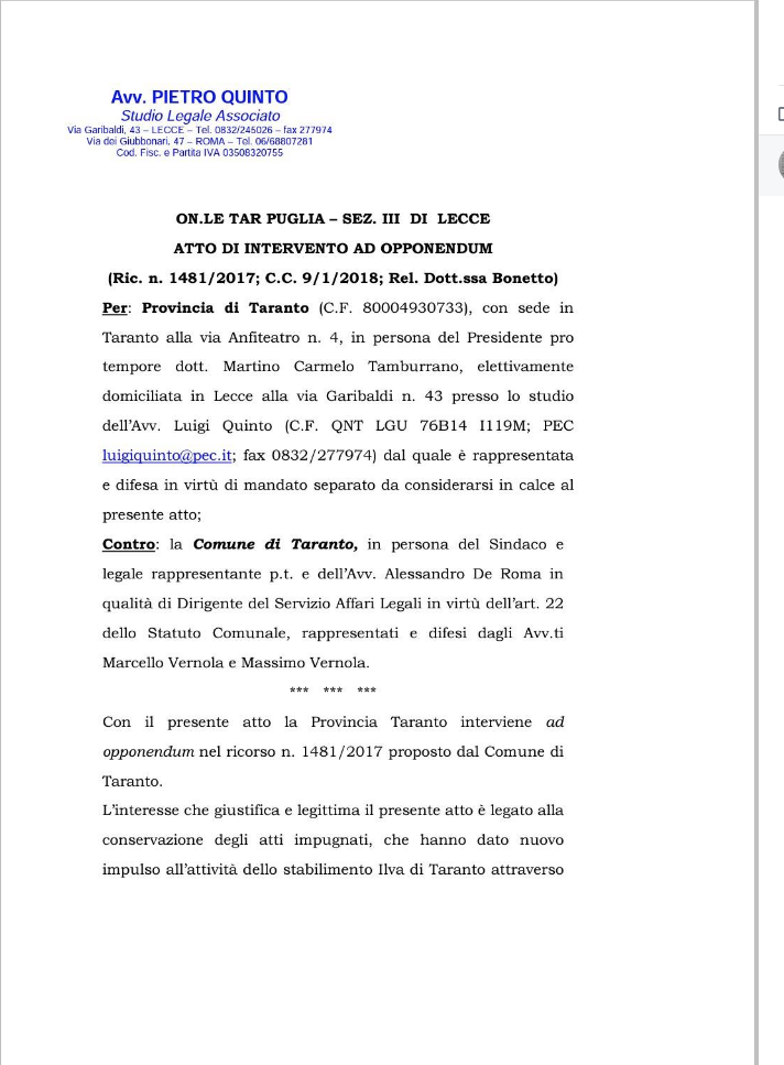 il ricorso ad opponendum presentato dalla Provincia di Taranto dinnanzi al Tar di Lecce, in favore del Governo