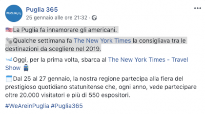 Le uniche foto della presenza pugliese alla manifestazione newyorkese sono quelle presenti solo sulla pagina Facebook di Puglia Promozione ( vedi QUI) dove si sostiene che “La Puglia fa innamorare gli americani. Qualche settimana fa The New York Times la consigliava tra le destinazioni da scegliere nel 2019″. Chiaramente tutto previo pagamento pubblicitario. E a Bari negli uffici della Regione Puglia la chiamano anche informazione….!