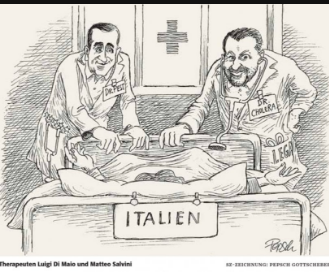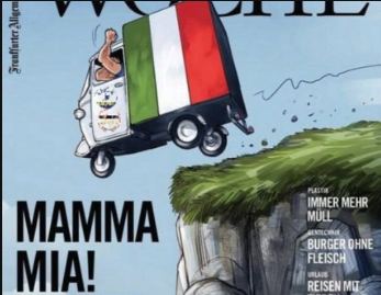 Per il quotidiano tedesco Frankfurter Allegemeinel’Italia è un’Ape-car che si lancia già da un burrone, il cui guidatore fa il gesto dell’ombrello. Significativo anche il titolo scelto: “Mamma mia!”. Ancora più forte la vignetta della Suddeutsche Zeitung, che immagina l’Italia come un malato nelle mani dei dottori Peste e Colera.