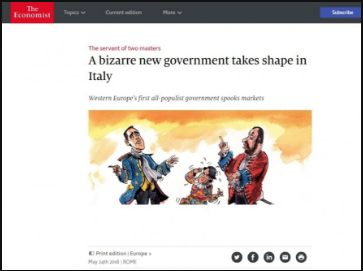 Dal Regno Unito alla Germania, le copertine e le vignette dei principali quotidiani e settimanali esteri non lasciano nulla all’immaginazione. Nel parlare della situazione politica italiana e del possibile nuovo governo, la satira è più che mai pungente. Per l’Economist l’Italia è “Serva di due padroni“, con Giuseppe Conte raffigurato nei panni di Arlecchino tra Luigi Di Maio e Matteo Salvini che discutono. Il settimanale finanziario della City inglese sottolinea che quello che sta per nascere è “il primo governo tutto populista dell’Europa occidentale” e specifica che, politicamente parlando, “in molti altri paesi Conte sarebbe un morto che cammina” a causa delle controversie sul suo curriculum gonfiato.