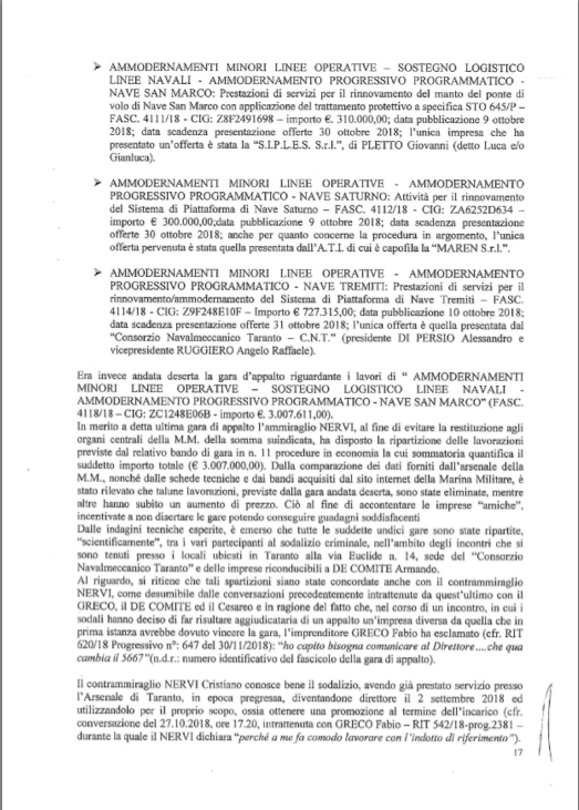 Il dato che emerge da una attenta lettura delle carte giudiziarie, è la presenza di “sistema” operante e regnante negli ambienti della Marina Militare a Taranto, da parte di chi è demandato a gestire gli acquisti ed appalti. Questa è infatti la terza inchiesta, la prima operazione fu dei Carabinieri, seguita dalle successive due approfondite indagini della Guardia di Finanza avvenute quando comandante provinciale a Taranto era il colonnello Gianfranco Lucignano, come molto correttamente dichiara il suo sostituto ed attuale comandante provinciale Col. Dell’ Anna.