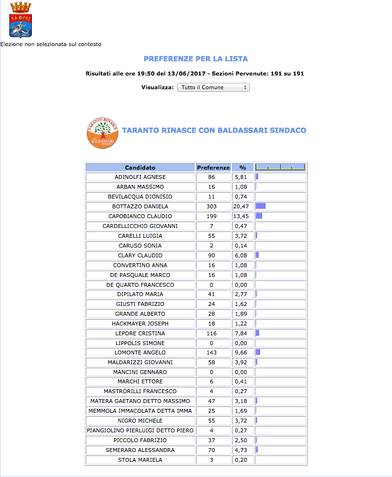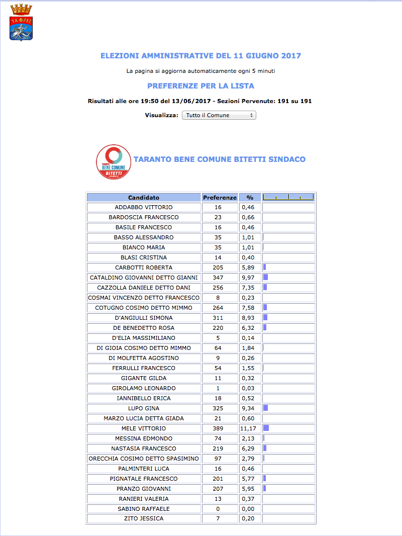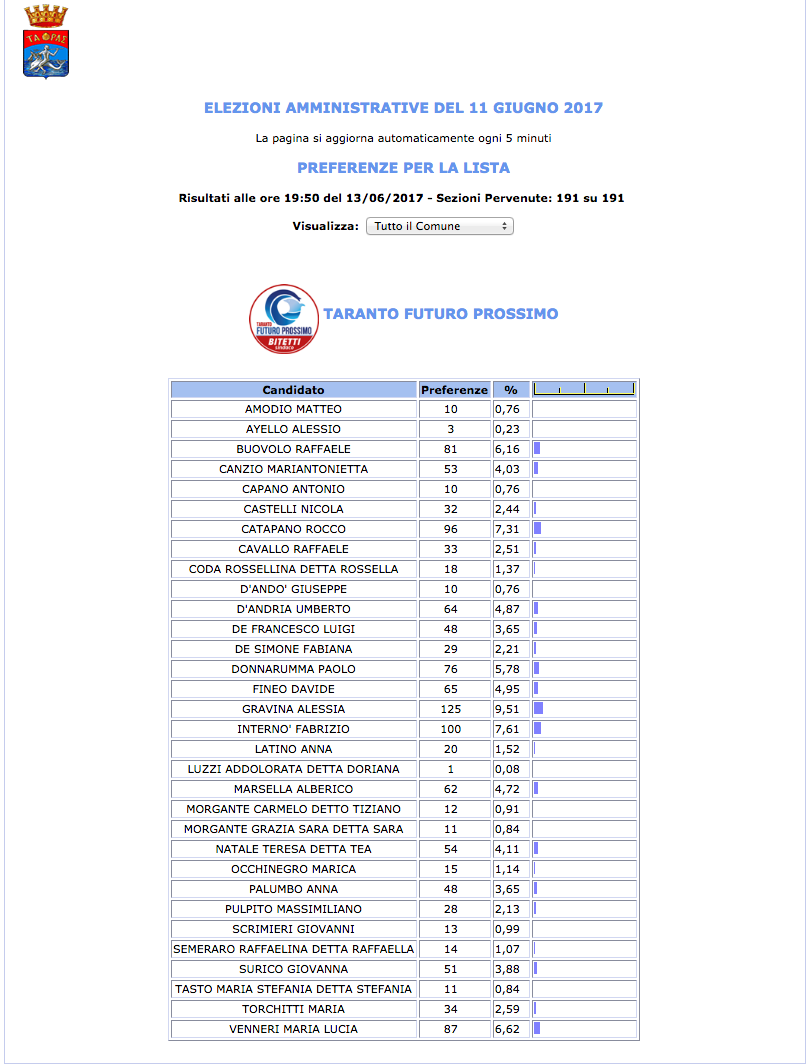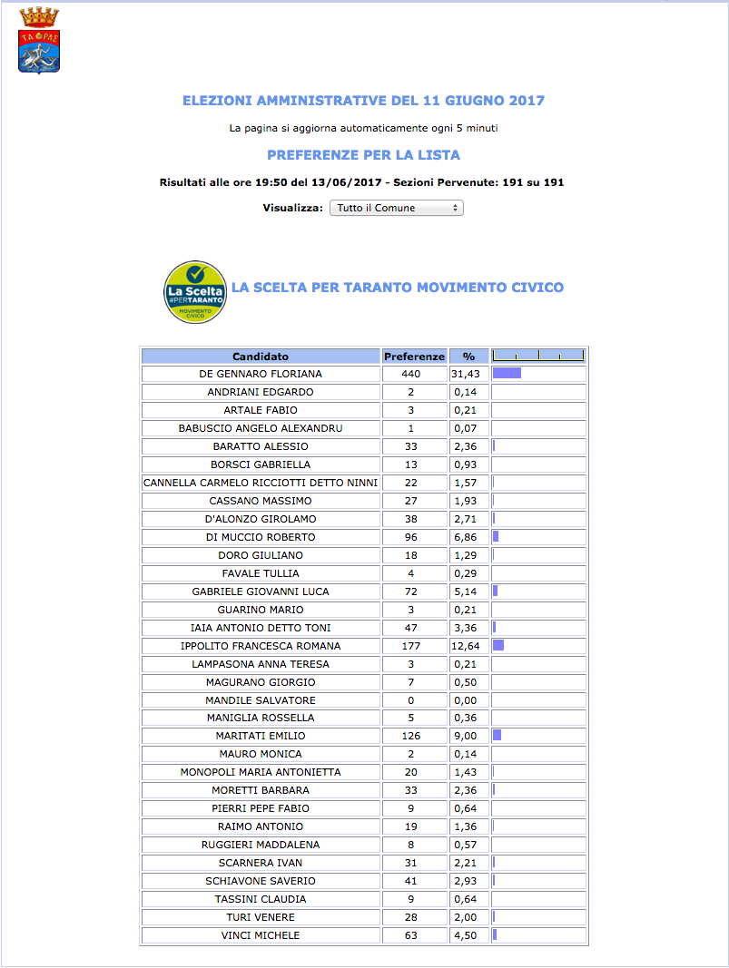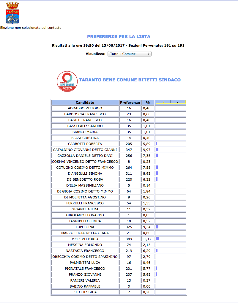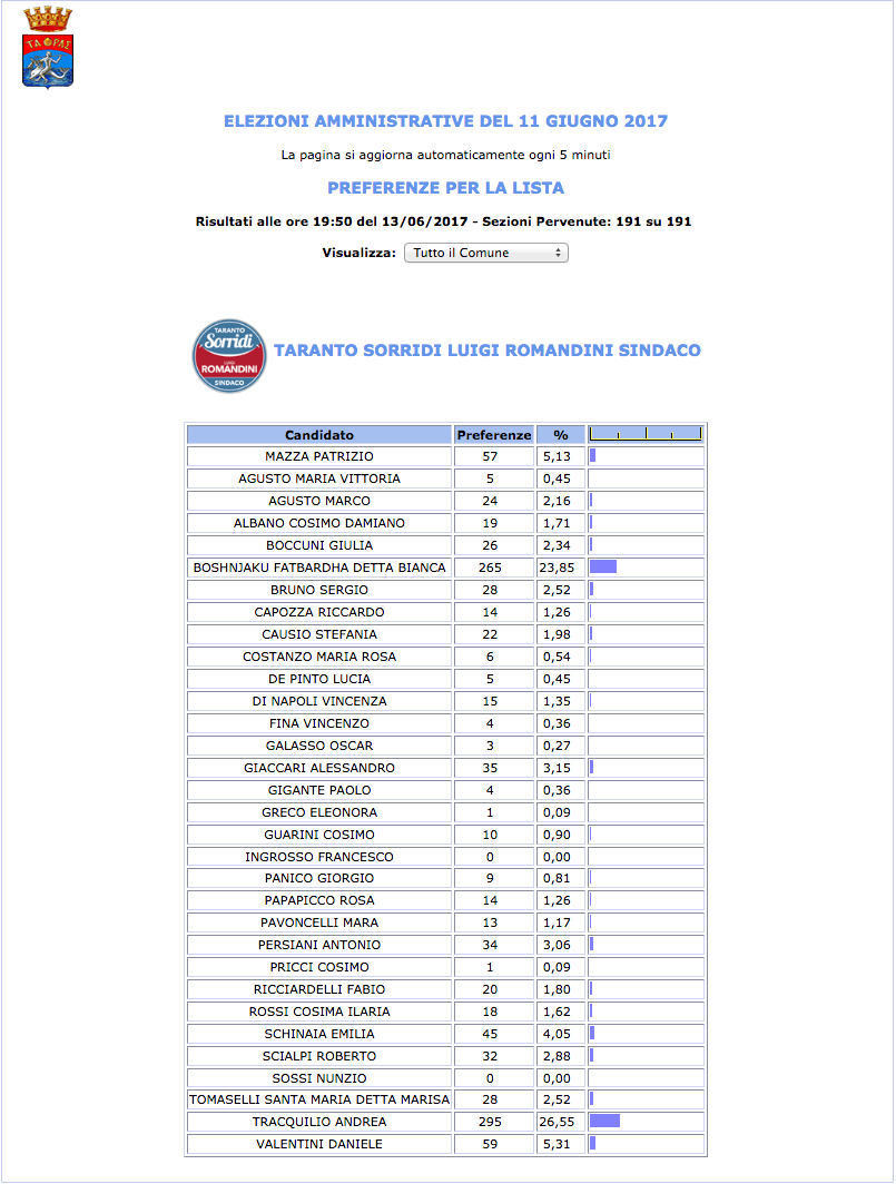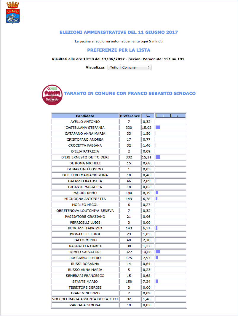 ROMA – Anche il Comune di Taranto fatica a pubblicare i dati definitivi delle preferenze dei candidati al Consiglio Comunale di Taranto. I dati che pubblichiamo sono “ufficiali“, e definitivi. Per leggere meglio le liste con le preferenze basta cliccare per due volte sopra l’immagine della lista di vostro interesse.