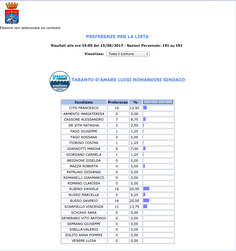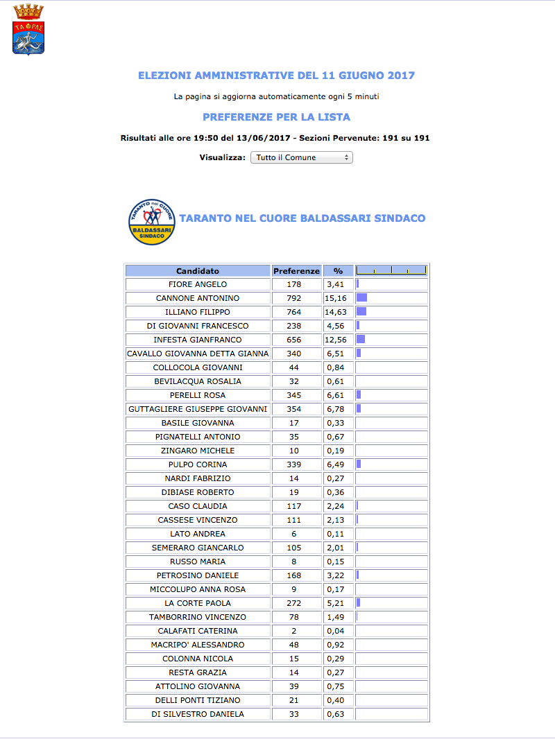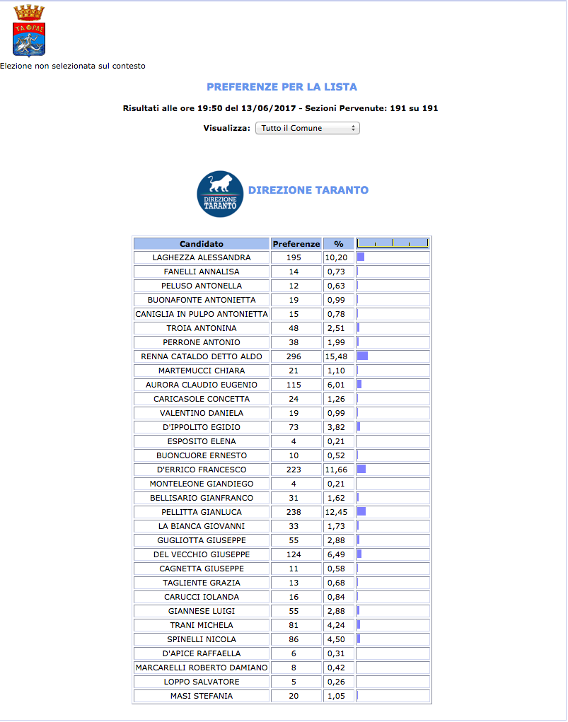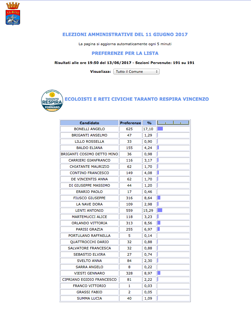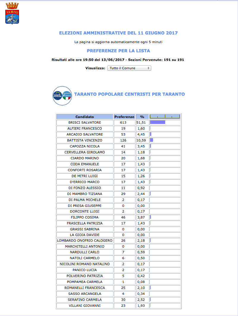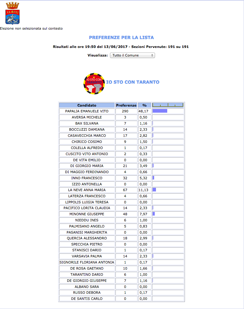 ROMA – Anche il Comune di Taranto fatica a pubblicare i dati definitivi delle preferenze dei candidati al Consiglio Comunale di Taranto. I dati che pubblichiamo sono “ufficiali“, e definitivi. Per leggere meglio le liste con le preferenze basta cliccare per due volte sopra l’immagine della lista di vostro interesse.