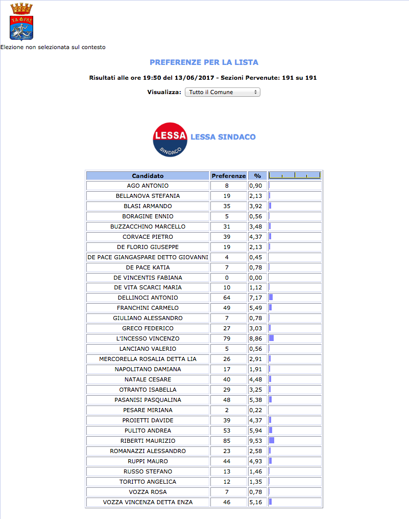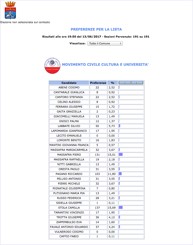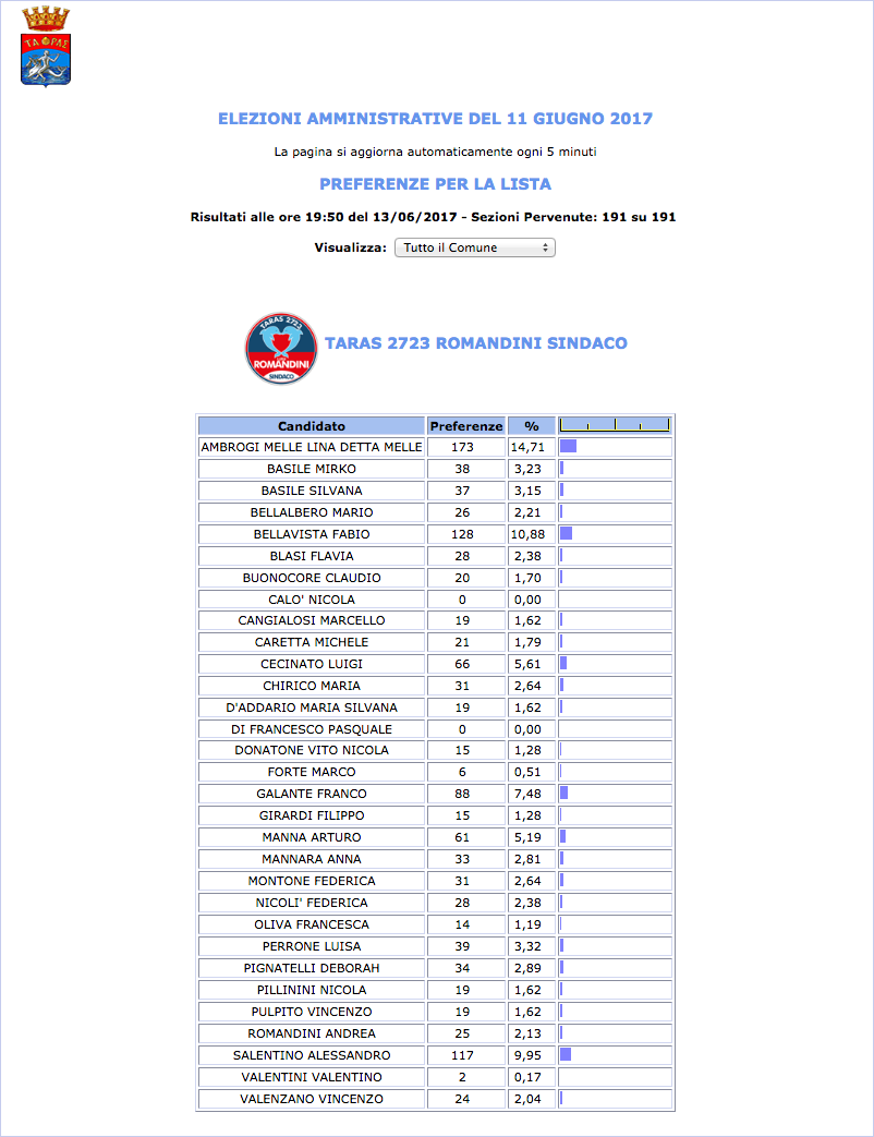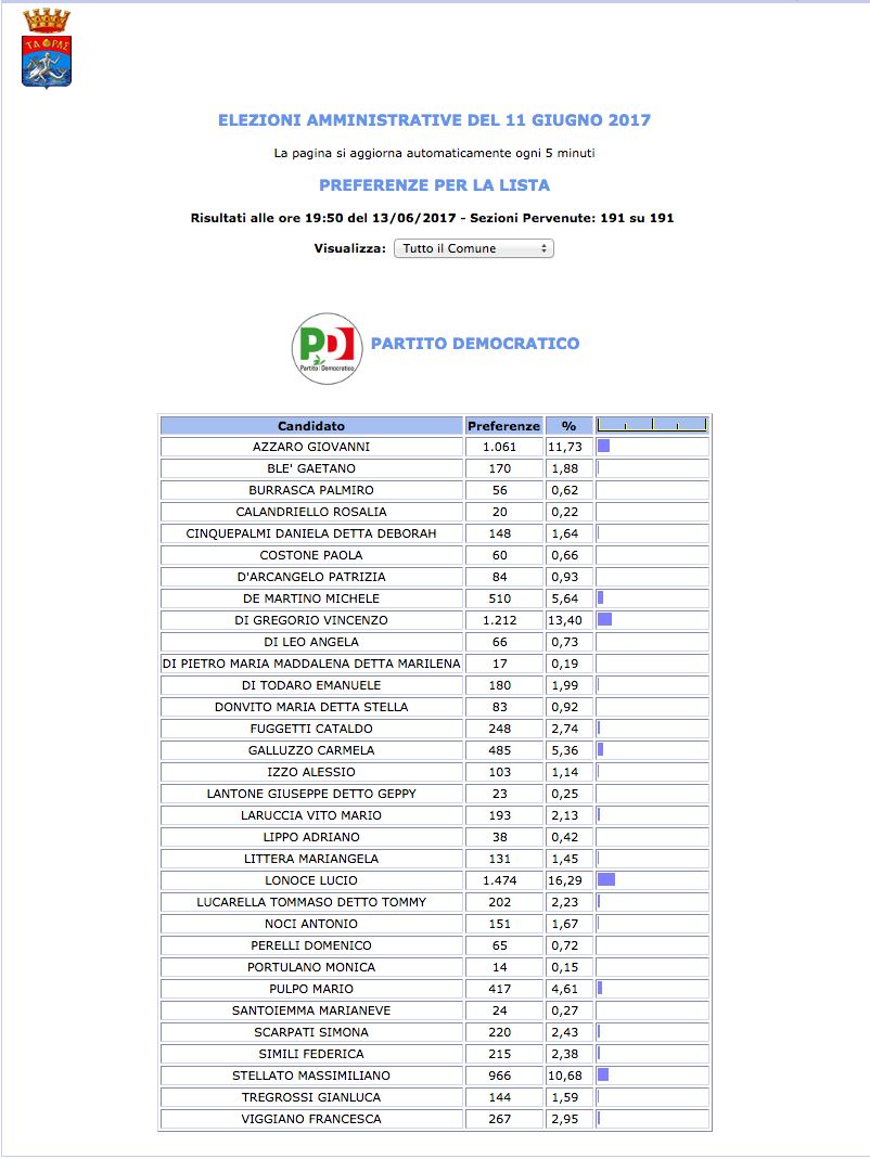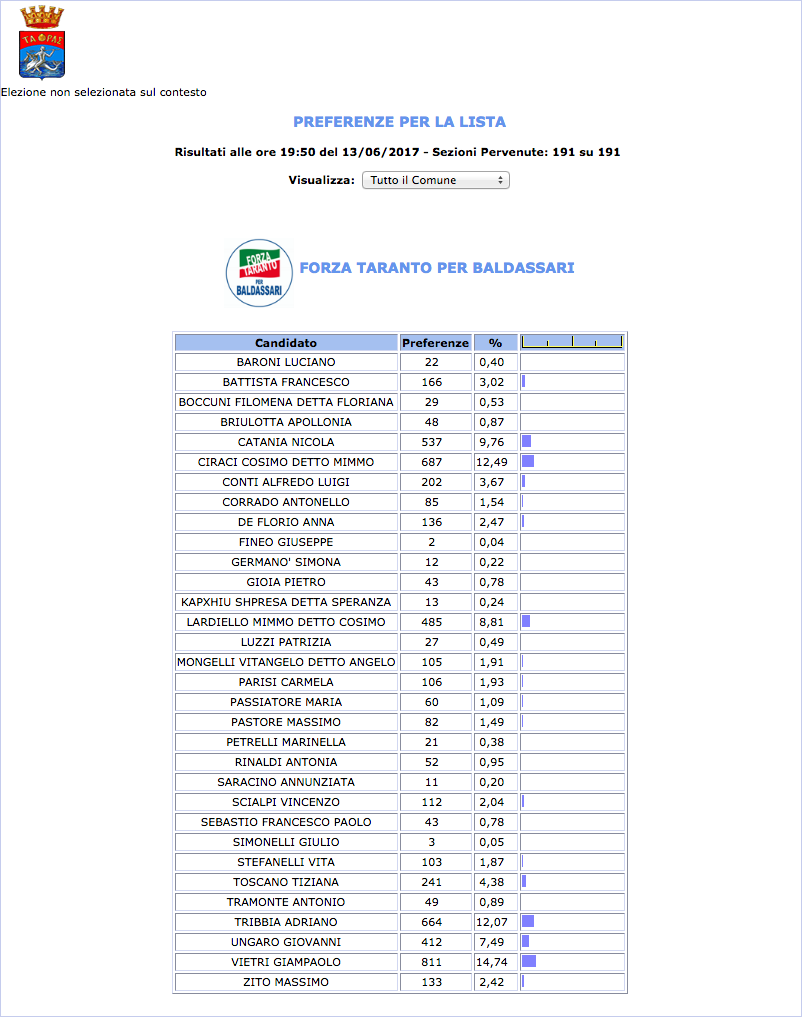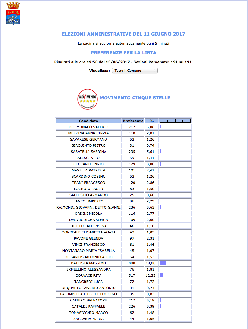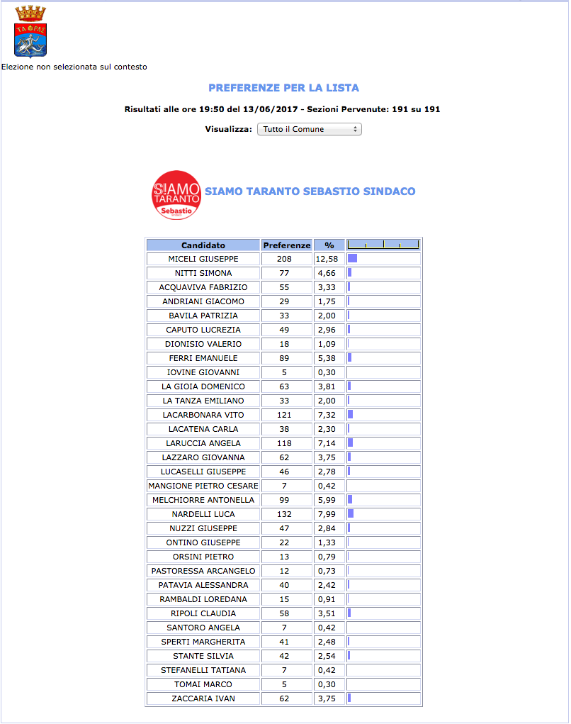 ROMA – Anche il Comune di Taranto fatica a pubblicare i dati definitivi delle preferenze dei candidati al Consiglio Comunale di Taranto. I dati che pubblichiamo sono “ufficiali“, e definitivi. Per leggere meglio le liste con le preferenze basta cliccare per due volte sopra l’immagine della lista di vostro interesse.
