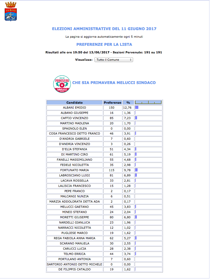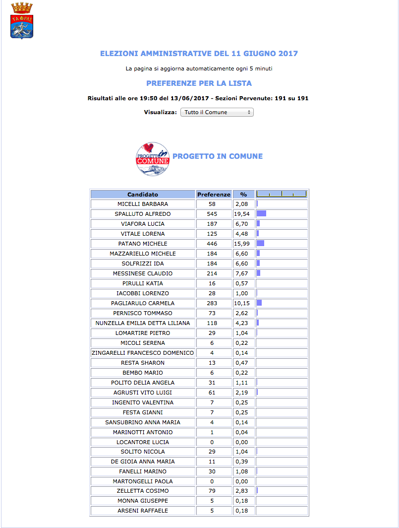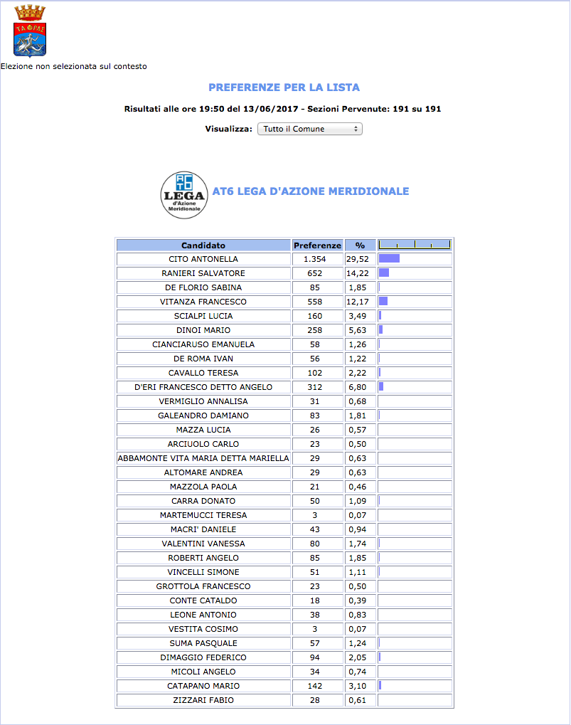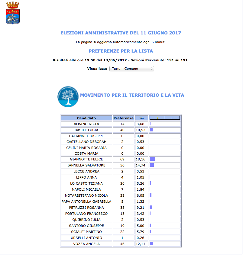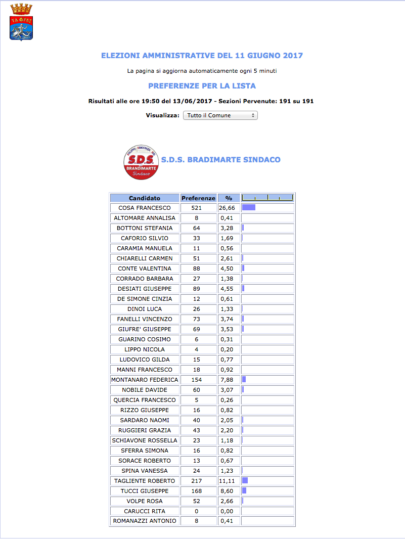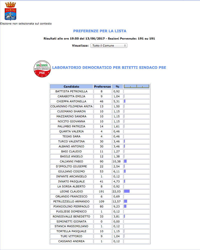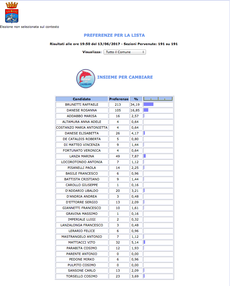 ROMA – Anche il Comune di Taranto fatica a pubblicare i dati definitivi delle preferenze dei candidati al Consiglio Comunale di Taranto. I dati che pubblichiamo sono “ufficiali“, e definitivi. Per leggere meglio le liste con le preferenze basta cliccare per due volte sopra l’immagine della lista di vostro interesse.