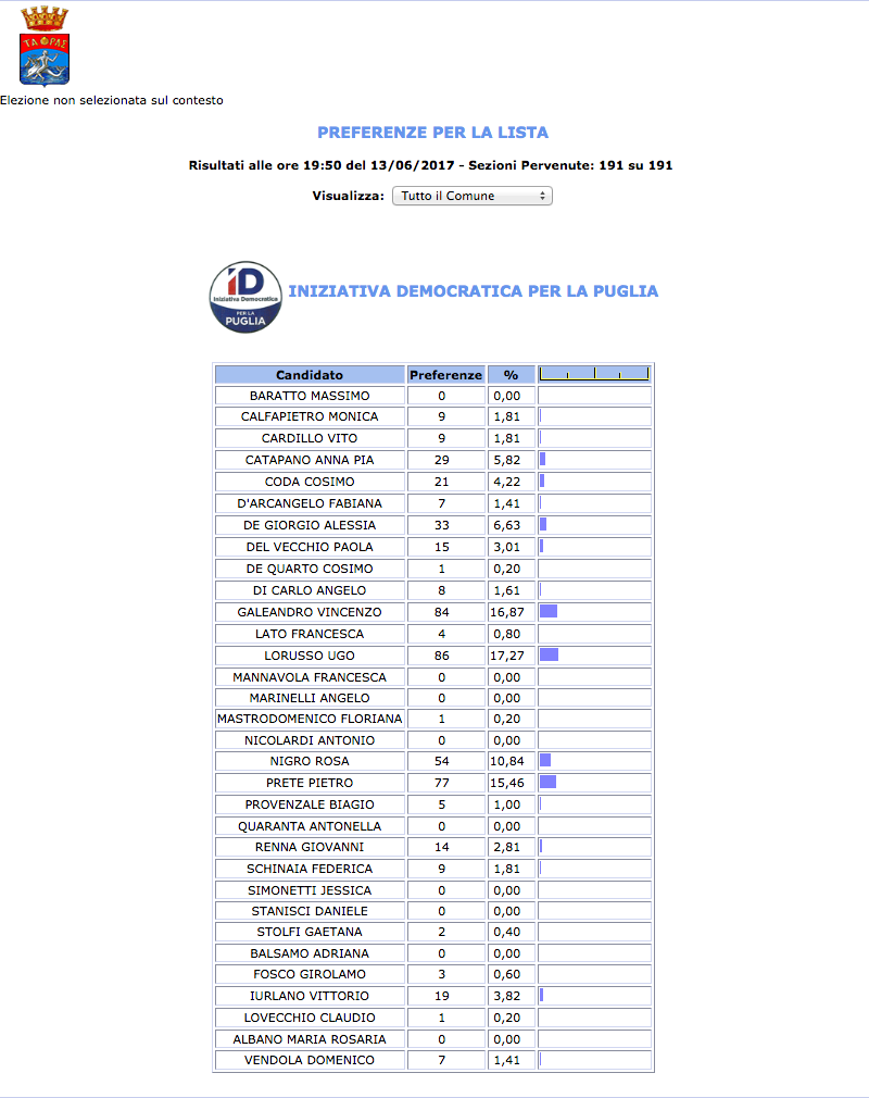Il dato importante è che i consiglieri comunali uscenti hanno sinora raccolto a stento il 50% in meno dei precedenti consensi, in particolare quelli provenienti dall’area di sinistra (SdS Stefàno, Vendola ecc.) come Filippo Illiano, Alfredo Spalluto, e quelli di centro destra ( Forza Italia, At6) Guttagliere, Ciraci, Perelli riciclatisi nelle cosiddette…liste civiche in appoggio alla candidatura a sindaco di Stefania Baldassari.