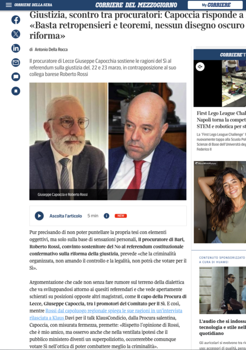 Al magistrato Roberto Rossi, procuratore capo di Bari, non è bastata la vergognosa distribuzione di volantini inneggianti al “NO” sul referendum per la riforma della giustizia dinnanzi al Teatro Petruzzelli di Bari, dopo essersi scagliato pubblicamente in un dibattito televisivo contro il viceministro della Giustizia, Francesco Paolo Sisto sul palco di un convegno lo scorso 19 novembre, gli disse “ti devi sciacquare la bocca quando parli di Falcone!” dimenticando che Giovanni falcone è sempre stato favorevole alla separazione delle carriere fra magistrati inquirenti (pubblici ministeri) e giudicanti (i giudici) così calpestando lui la memoria di Falcone ! . Esponente della corrente “sinistrorsa” di Area, Rossi si appresta a candidarsi la guida della Procura di Roma e quella di Milano, i cui vertici sono di prossima scadenza.