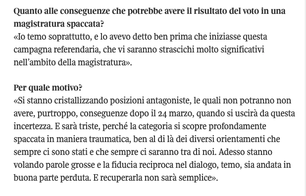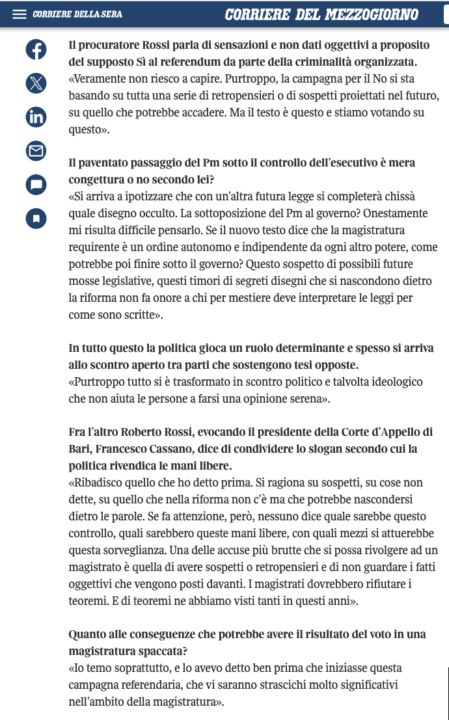 Ha ragione il quotidiano Il Dubbio quando scrive che Il punto è un altro: “il procuratore di Bari risponde così al Corriere quando gli si chiede se la campagna referendaria dei magistrati è un’azione politica: «La battaglia per il No è per i cittadini di fronte al potere politico». In pratica, Rossi vuole descrivere (e spacciare) l’ordine giudiziario come una schiera di “salvatori della patria”, investita di una storica missione: evitare che quei disgraziati dei politici compiano le loro nefandezze. Vi sembra una novità? No, non lo è. È il solito schema.