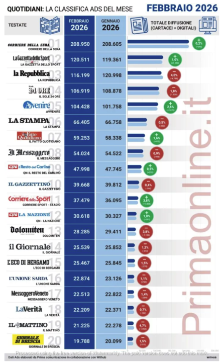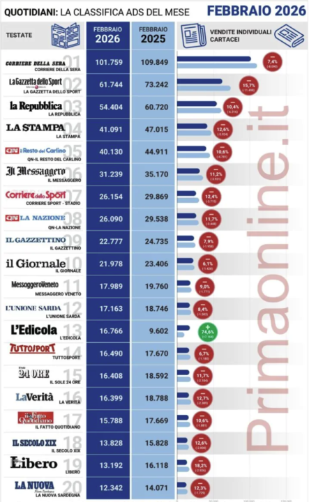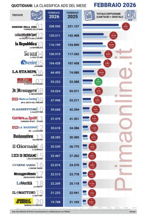 Tra le principali testate nazionali a registrare il calo più evidente è stato per Il Mattino (-4,7%). In senso opposto, i segnali di crescita maggiore arrivano da Avvenire, quinto +2,6%, e dal Corriere dello Sport (+3,8%). Sempre guardando alla diffusione, ma questa volta raffrontando i dati mensili 2026 con quelli di febbraio 2025 la classifica si tinge quasi completamente di rosso. Fa eccezione Il Fatto Quotidiano che cresce del 10,6%. Tra i cali più marcati, che vanno in doppia cifra, Gazzetta dello Sport (-15,4%), Repubblica (-13,9%) La Verità (-11,6%), Qn – La Nazione (-11%) e la Stampa (-10,4%).