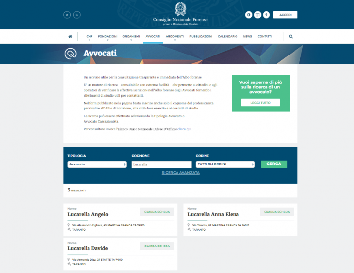 Così come abbiamo verificato (al contrario dell ANSA di Bari) non è avvocato, come si evince consultato dall’ albo del Consiglio Nazionale Forense. Per eccesso di zelo abbiamo controllato, non è iscritta nell’ albo degli avvocati di Roma (città dove dovrebbe risiedere) così come non è iscritta albo degli avvocati di Taranto e provincia (ove è nata). Quindi sia la Regione Puglia che l’ ANSA dicono il falso allorquando la indicano come “avvocato”. Di lei il CORRIERE DEL GIORNO si è già occupato in tempi non sospetti (nel giugno 2015) , rivelando una situazione a dir poco imbarazzante.