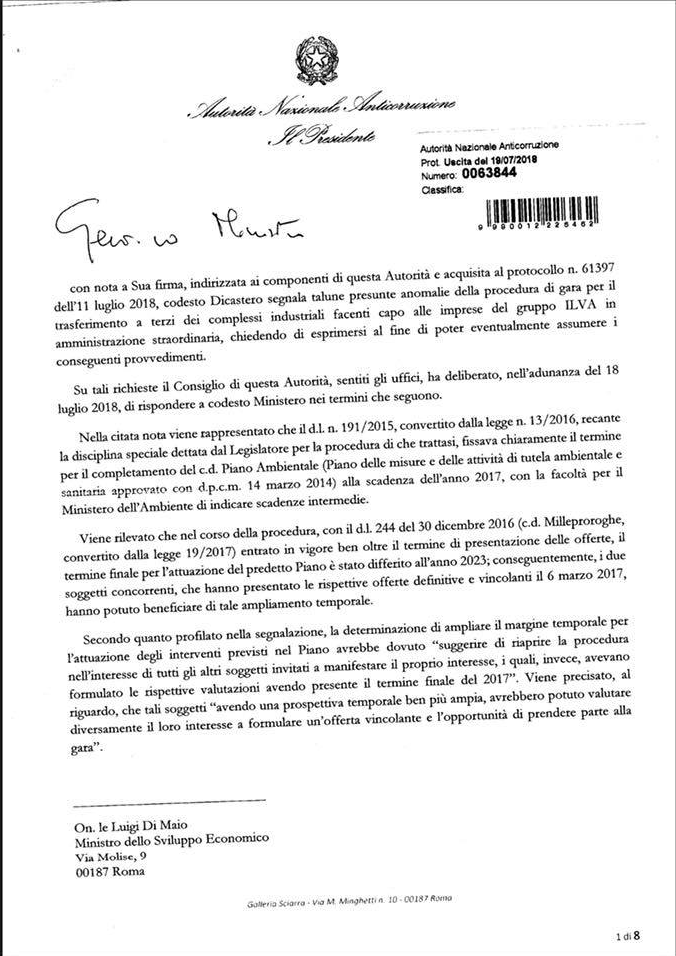 Di Maio, pur consapevole che “il tempo è poco” ha annunciato l’avvio di una procedura di accertamento sulla gara per capire “chi non ha sorvegliato“. “Chiederò chiarimenti ai Commissari, avvierò un’indagine interna al ministero e chiederò un parere all’Avvocatura dello Stato” ha detto definendo “inspiegabile il comportamento tenuto dal Mise”. “I rilievi dall’Anac – ha detto – “sono gravissimi” “L’offerta di AcciaItalia era la migliore, ma nel bando metà del punteggio era dato al prezzo” e non al piano ambientale e alla salute “Per questo è stata scelta Arcelor“.