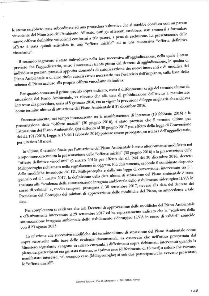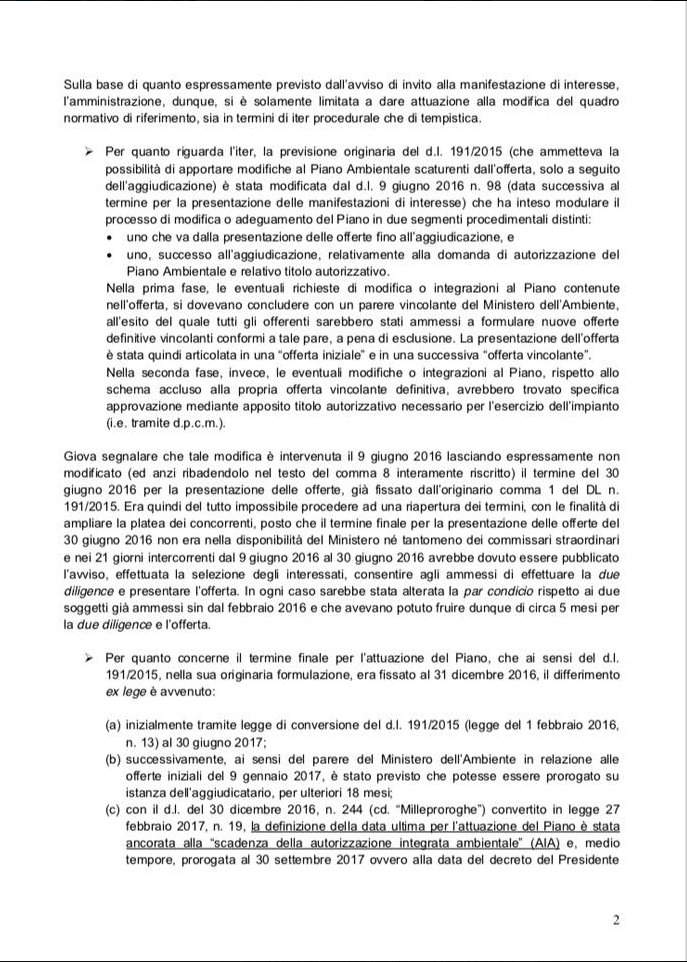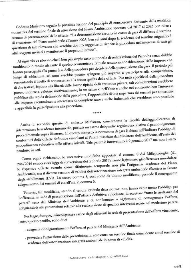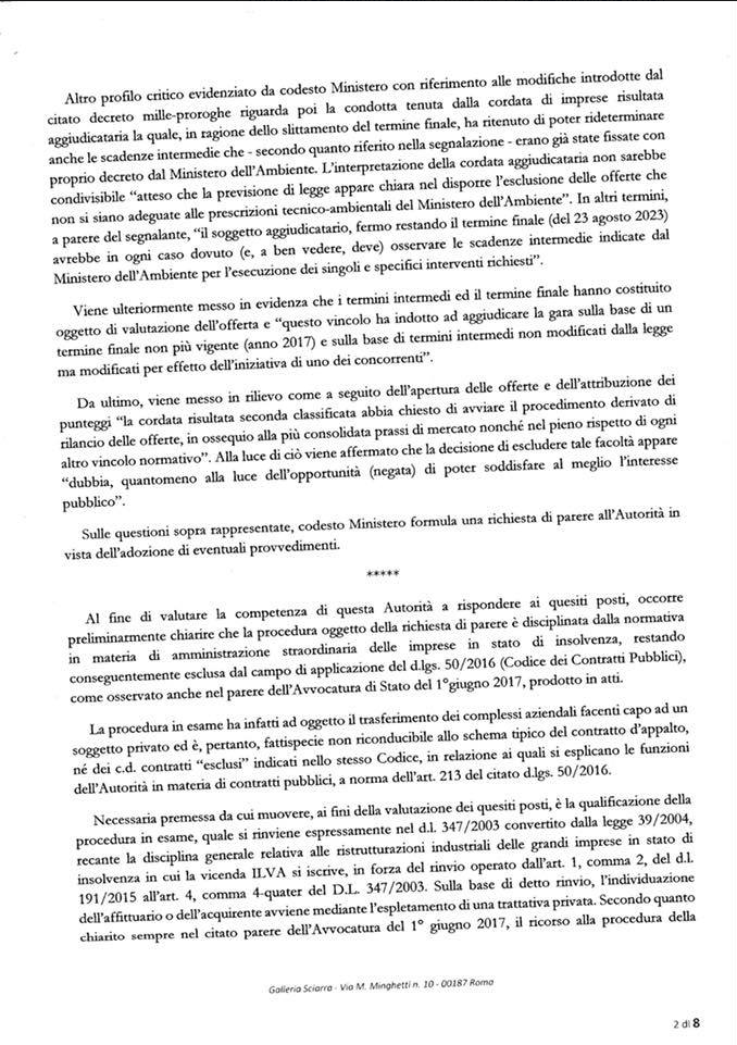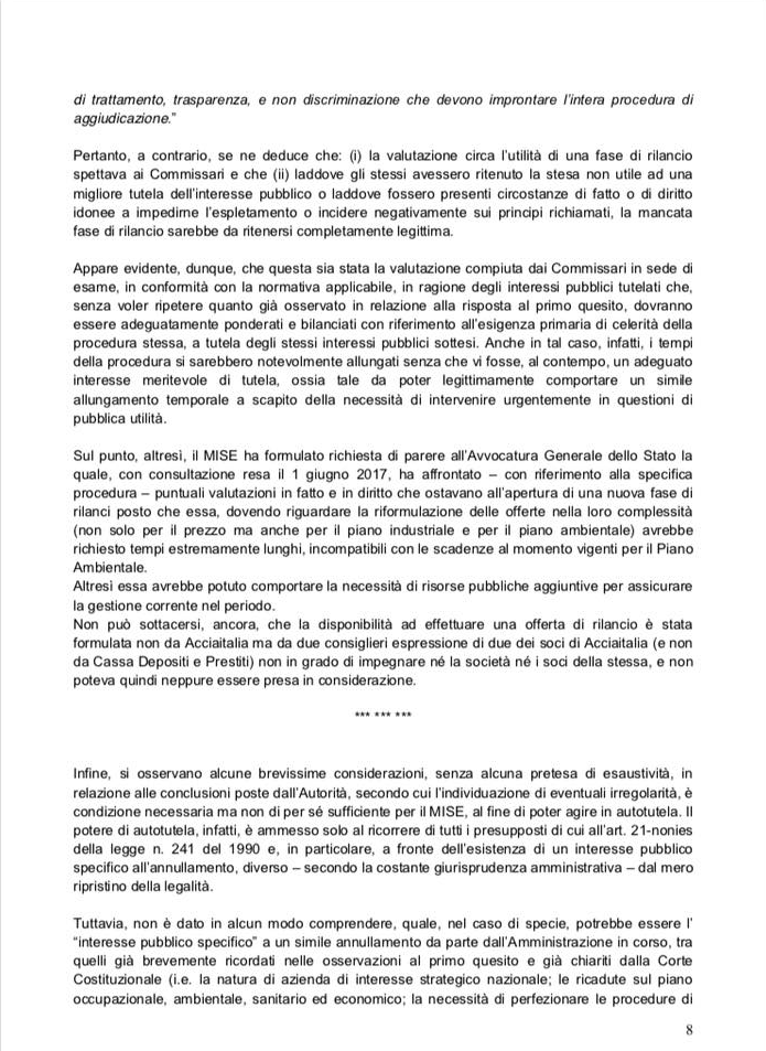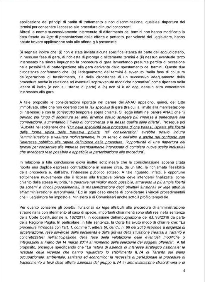 “E assumiti la responsabilità di annullare la gara se la ritieni viziata” – ha concluso l’ex-ministro. – “Pubblico il parere dell’Avvocatura di Stato su rilanci e riapertura della gara e possibile non aggiudicazione a Mittal sulla base del rischio antitrust. Ognuno giudichi”