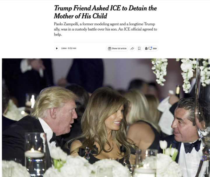 Un’inchiesta del New York Times su un presunto abuso di potere Paolo Zampolli, l’ex agente di modelle noto per aver presentato Melania a Donald Trump, che lo ha nominato proprio inviato speciale con particolari deleghe dal valore esclusivamente simboliche, ed infatti non risulta accreditato diplomaticamente in Italia. Secondo l’autorevole e documentato quotidiano americano, Zampolli a giugno 2025 avrebbe contattato un alto funzionario dell’Ice per segnalare che la sua ex compagna brasiliana, Amanda Ungaro contro la quale eranel pieno di una battaglia legale per la custodia del figlio adolescente, si trovava negli Stati Uniti illegalmente. La donna venne arrestata in un carcere di Miami con l’accusa di frode sul luogo di lavoro.