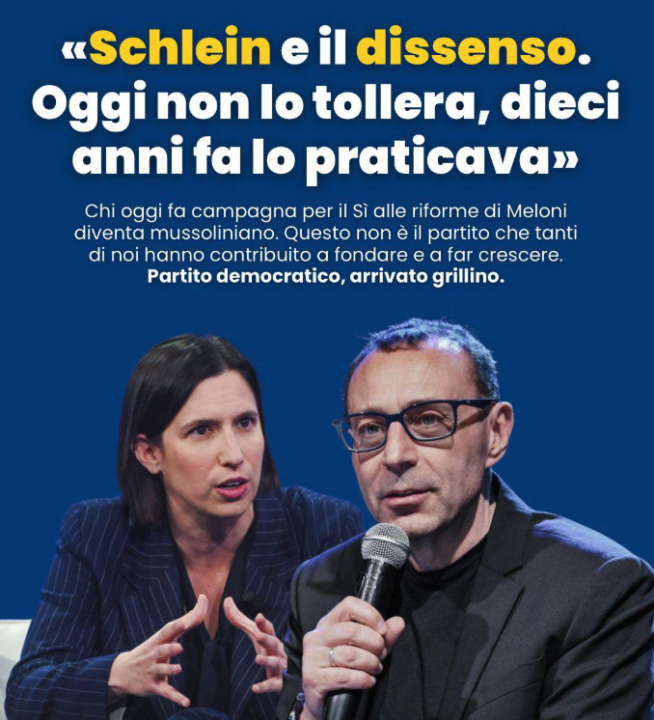 Ripensando a quella stagione, emerge anche una chicca che molti oggi sembrano aver dimenticato (o che forse mai hanno avuto modo di vedere). Dieci anni fa Elly Schlein, in un lungo scritto sul suo blog personale dal titolo “Per votare No, #bastaleggerla”, si scagliò senza mezzi termini contro un governo amico. Un attacco politico molto significativo, che segnò l’inizio di una scalata personale e politica che l’ha portata dov’è oggi. Immagino che allora la segretaria ritenesse che il dissenso interno fosse non solo legittimo, ma da valorizzare come segno di vitalità democratica.