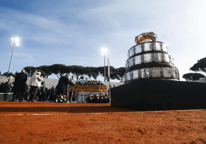 Il feretro della leggenda del tennis italiano è arrivato poco prima delle 9 quando si è aperta la camera ardente nel campo dedicato al Foro Italico. Ad attenderlo il trofeo della Coppa Davis che non ha più la formula che gli piaceva, ma gli ha regalato una delle grandi emozioni delle ultime settimane, dei fiori biancazzurri, una corona di fiori di Ilie Nastase ed una di Ion Tiriac. un maxi schermo installato con le sue immagini e le note di Charles Aznavour. La bara sul campo e di lato la foto in bianco e nero mentre Nicola Pietrangeli solleva la coppa Davis a Santiago del Cile.