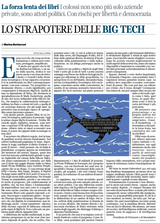 “L’intreccio tra politica e BigTech negli Stati Uniti è sotto gli occhi di tutti e porta enormi vantaggi a un Paese che della tecnologia ha bisogno per affrontare le sfide geopolitiche”, prosegue la presidente di Fininvest e di Mondadori nella sua lettera al direttore. “Lo sappiamo, ma è bene ricordarlo: questi colossi non sono più solo aziende private, sono attori politici. Con una differenza sostanziale rispetto a chi fa politica di mestiere: i padroni della Silicon Valley restano sempre al loro posto. Grazie a una buona dose di ipocrisia, sono passati dal wokismo al trumpismo con la disinvoltura di un cambio di felpa. Del resto, nell’era della polarizzazione si sbanda da un eccesso all’altro. Ma intanto libertà e democrazia rischiano di finire stritolate nella morsa degli opposti, che distrugge il dialogo e alimenta l’intolleranza”