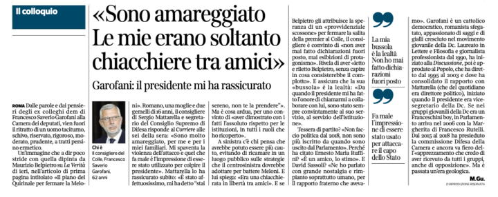 Secondo fonti del Quirinale Mattarella si è indispettito non poco per la richiesta di smentita, avanzata dal capogruppo di FdI Galeazzo Bignami, per le accuse di un fantomatico complotto della Presidenza della Repubblica, pubblicate da La Verità : per il Capo dello Stato è a dir poco importante sapere se realmente la leader del primo partito di governo abbia dato credito a simili bugie, cioè ad un presunto piano dei suoi consiglieri per ostavolare il cammino e lavoro di Giorgia Meloni. A sua volta la presidente del Consiglio è rimasta molto male perché il consigliere Francesco Saverio Garofani, non ha rettificato le “chiacchiere tra amici” in un locale pubblico ascoltate da un giornalista dell quotidiano di destra .