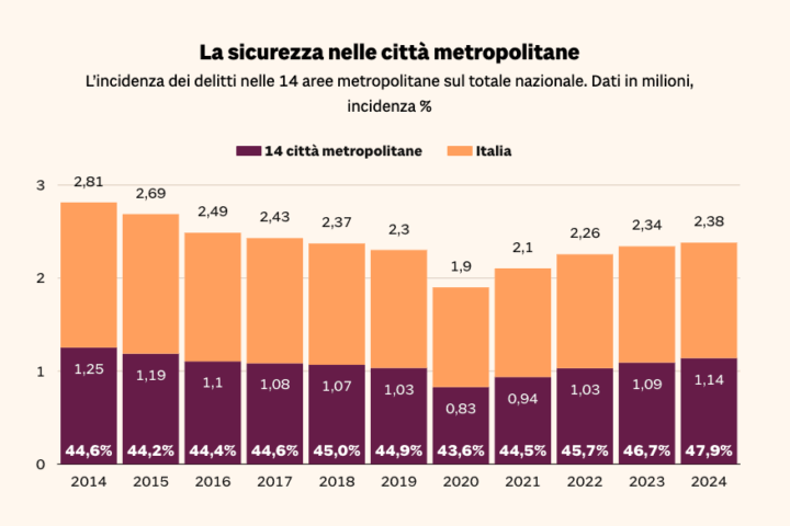 Il 2024 ha visto consolidarsi l’aumento della criminalità in corso post-pandemia, anche se dai dati provvisori dei primi sei mesi del 2025 arriva già un primo segnale di miglioramento (-4,9% rispetto allo stesso periodo dell’anno precedente in base ai trend non consolidati del Viminale). Si ricorda che a giugno di quest’anno il Governo ha ottenuto il via libera definitivo del Parlamento al Decreto sicurezza (Dl 20/2025) che, tra le altre cose, introduce nell’ordinamento 14 nuovi reati, inasprisce alcune aggravanti ed estende il Daspo urbano.