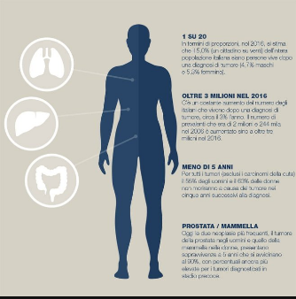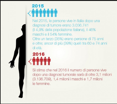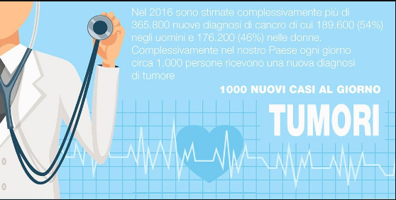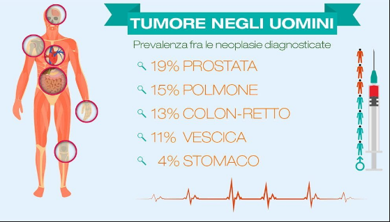 Nel 2016 sono stimate complessivamente più di 365.000 nuove diagnosi di cancro. Escludendo i carcinomi della cute (non melanomi), il tumore più frequente, nel totale di uomini e donne, risulta quello del colon-retto con 52.000 nuove diagnosi stimate per il 2016 (29.500 uomini e 22.900 donne), seguito dal tumore della mammella con circa 50.000 nuovi casi; seguono il tumore del polmone con oltre 41.000 nuovi casi (27.800 uomini e 13.500 donne), il tumore della prostata con 35.000 nuove diagnosi ed il tumore della vescica con circa 26.600 nuovi casi (21.400 tra gli uomini e 5.200 tra le donne).