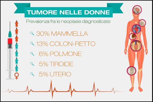 Negli uomini prevale il tumore della prostata che rappresenta il 19% di tutte le neoplasie diagnosticate; seguono quello del polmone (15%), del colon-retto (13%), della vescica (11%) e dello stomaco (4%). Tra le donne il cancro della mammella rappresenta il 30% delle neoplasie, seguito da colon-retto (13%), polmone (6%), tiroide (5%) e corpo dell’utero (5%).