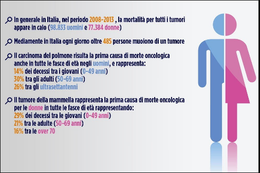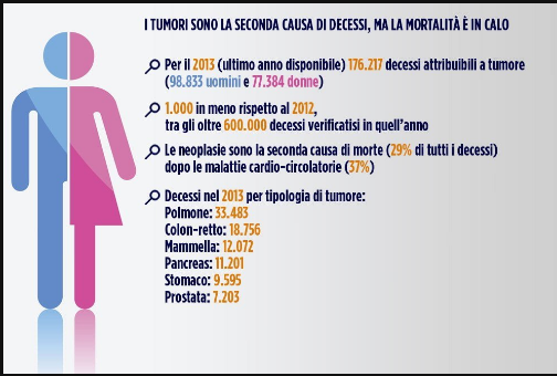 La mortalità. I dati dell’Istat indicano per il 2013 (ultimo anno disponibile) 176.217 (98.833 fra gli uomini e 77.384 fra le donne) , 1.000 decessi attribuibili a tumore in meno rispetto al 2012, tra gli oltre 600.000 decessi verificatisi in quell’anno. Le neoplasie sono la seconda causa di morte (29% di tutti i decessi) dopo le malattie cardio-circolatorie (37%). Il tumore che ha fatto registrare nel 2013 il maggior numero di decessi è quello al polmone (33.483), seguito da colon-retto (18.756), mammella (12.072), pancreas (11.201), stomaco (9.595) e prostata (7.203). “La mortalità continua a diminuire in maniera significativa in entrambi i sessi come risultato di più fattori” conclude Carmine Pinto, presidente nazionale Aiom “quali la prevenzione primaria (e in particolare la lotta al tabagismo, alla sedentarietà e a diete scorrette), la diffusione degli screening su base nazionale e il miglioramento diffuso delle terapie in un ambito sempre più multidisciplinare e integrato“.