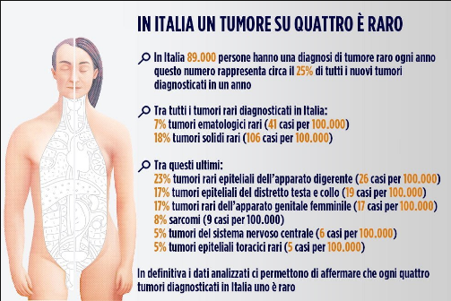 I tumori rari. Si calcola che ogni quattro tumori diagnosticati in Italia uno è raro. Per questo il libro “I numeri del cancro in Italia 2016” contiene anche un capitolo interamente dedicato alle neoplasie rare che colpiscono in Italia 89mila persone ogni 12 mesi . Il 7% è costituito da tumori ematologici rari (41 casi per 100.000) e il 18% da tumori solidi rari (106 casi per 100.000). I pazienti con un tumore raro sono in media più giovani di quelli con un tumore frequente. “La sopravvivenza a cinque anni è pari al 55% rispetto al 68% dei tumori più frequenti. Devono essere programmati percorsi dedicati per questi malati, perché sono numerosi i pazienti e le famiglie che, per la frammentazione delle competenze o in mancanza di punti di riferimento, sono spesso costretti a onerosi spostamenti con costi sociali elevati” spiega Mangone.