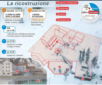 Le due vittime identificate . Il tempo della gioia e del sollievo e il tempo del dolore più cupo si sono alternati nelle lunghe ore di lavoro tra le macerie: perché tra le notizie confermate c’è anche l’identificazione delle prime due vittime accertate del disastro: Alessandro Giancaterino, fratello dell’ex sindaco di Farindola e capo cameriere dell’hotel, ed un cameriere Gabriele D’Angelo, che era anche un volontario della Croce Rossa locale: tra i soccorritori ovviamente ci sono altri volontari della stessa organizzazione che ora lo piange.