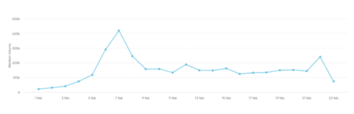 Trend delle uscite che citano MilanoCortina su tutti i media. Periodo di analisi: 1-23 febbraio. Fonte: Mimesi