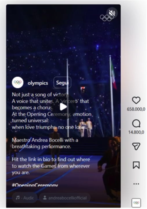 Oltre al picco di interazioni registrato, sono stati particolarmente commentati i momenti artistici e simbolici: le performance di Mariah Carey e Andrea Bocelli hanno celebrato la cultura italiana davanti a un pubblico globale, mentre Erin Jackson, prima donna di colore a portare la bandiera degli Stati Uniti ai Giochi invernali, è stata percepita come un potente segnale di inclusione e progresso. Il post pubblicato dal canale Instagram ufficiale dei giochi olimpici sulla performance di Andrea Bocelli ha raccolto da solo 658mila like. (Fonte:Mimesi).